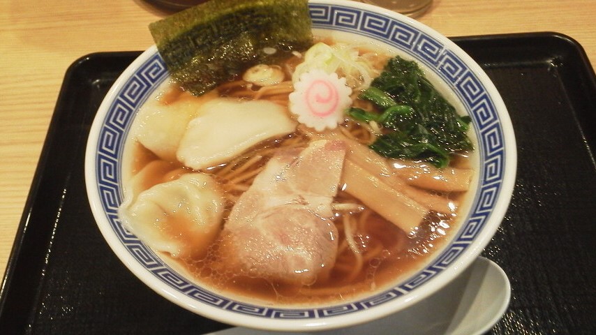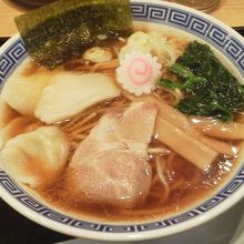 スープは出汁が効いた正油。付け合わせの豚肉スライス(1枚)が非常に旨い!水餃子は皮衣が分厚く、