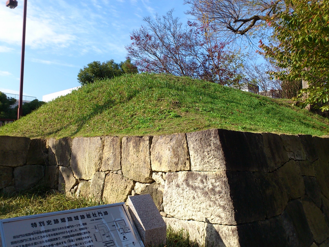 姫路城の南側の国道2号線沿い、姫路市民会館の入り口付近に総社門跡があります。跡と云う名の通り、門はなく石垣だけが残っています。それも道をまっすぐ通すために、石垣の一部が撤去されてしまっており、残念な形です。すぐ近くに播磨国総社の射楯兵主神社があることから、この名前がついたようです。