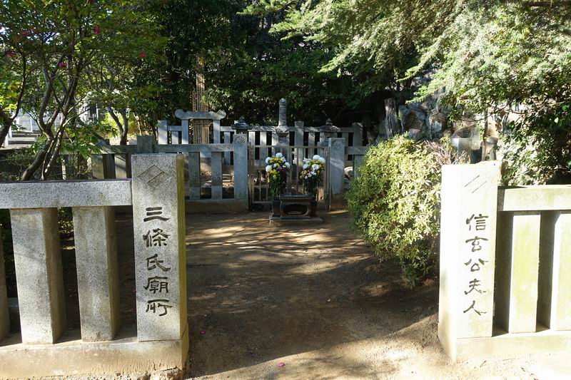 円光院の墓地の一画にある武田信玄の正室三条の方の墓所です。石段を上り、本堂の左手を案内に従って山裾を少し登った所にあります。他の一般の墓とは明らかに違うので分かると思います。門柱には武田菱と家紋と共に「信玄公夫人三條氏廟所」と彫られていました。