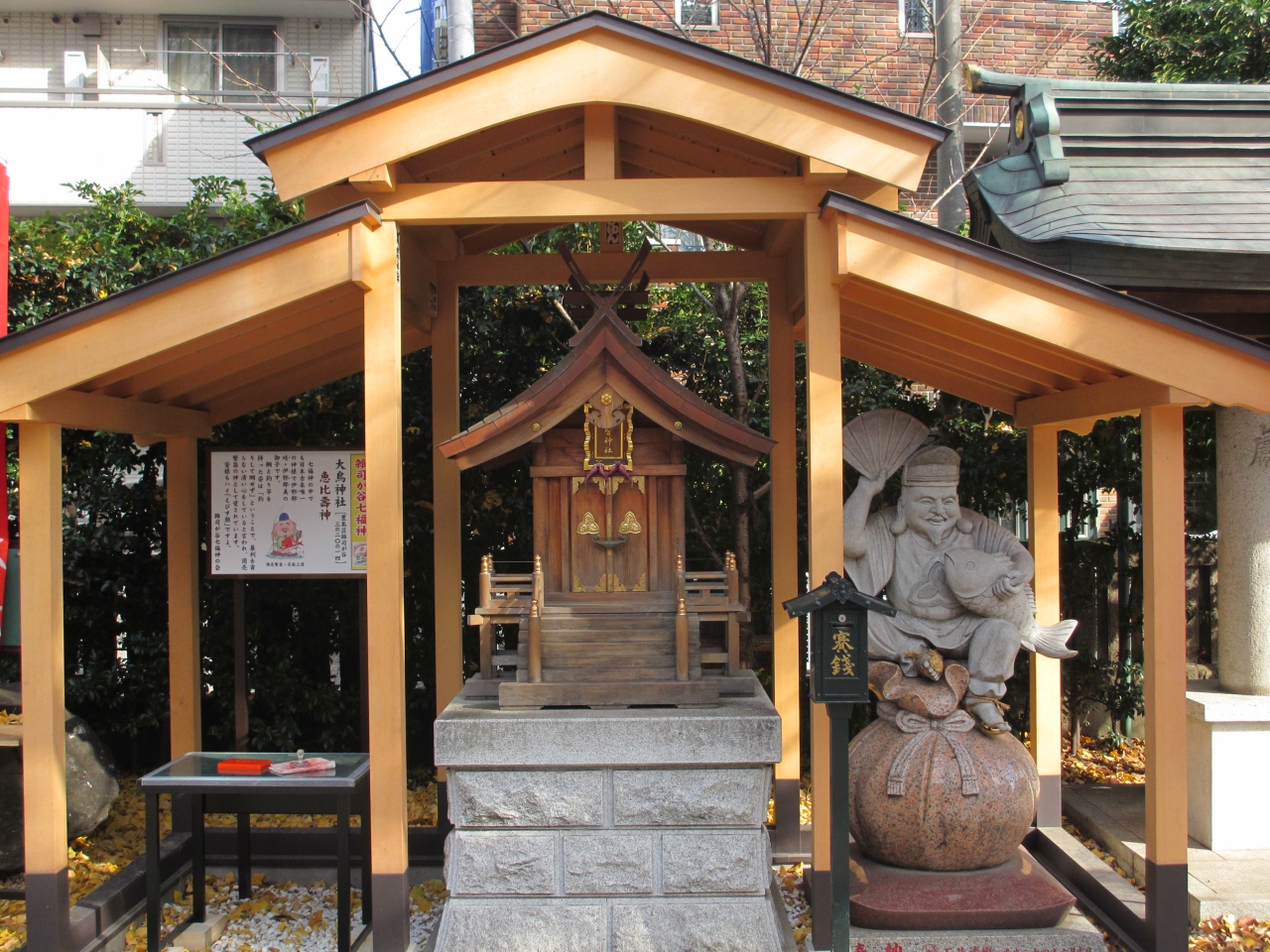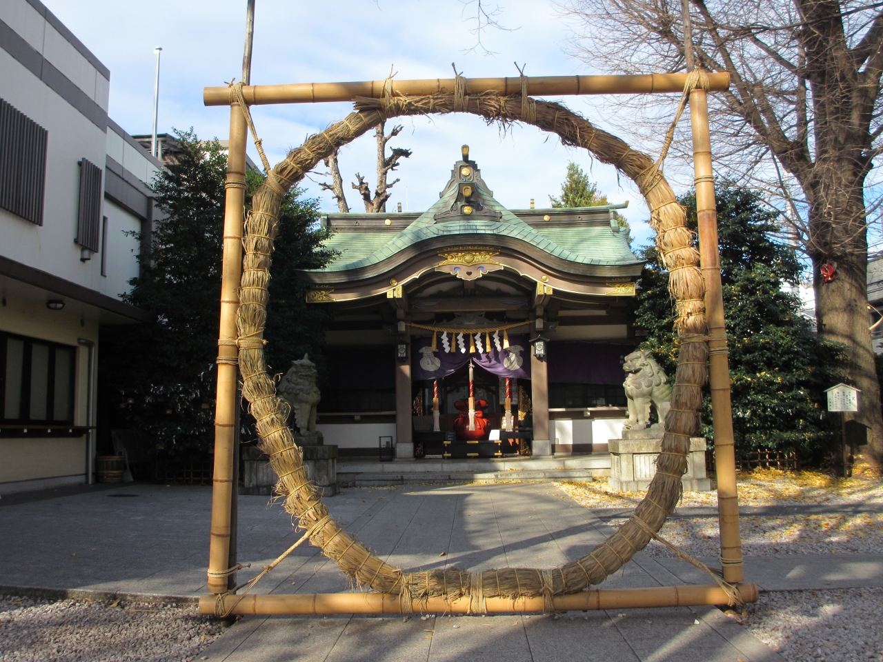 都電・雑司ヶ谷駅近く、弦巻通り沿いにある神社です。雑司ヶ谷七福神の一つ、商売繁盛の神である恵比寿神が祀られています。本殿前には、左、右、左に三周すると願いがかなうと言われている大きな茅輪が設置されています。七福神の色紙も販売されています。