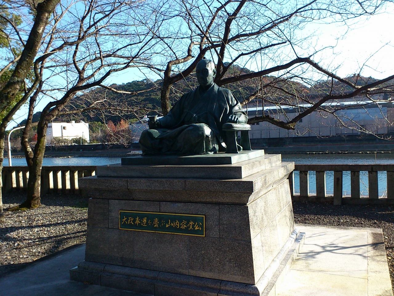 高知城や高知県県庁から川の方へ向かっていくとある土佐の国一の宮の神社の土佐神社の中にある像です。酒杯を持って座っている姿です。長曾我部氏が建立した主殿に向かい合うような向きで、川沿いにあります。土佐藩の最後の藩主で、大政奉還を進言したことで有名ですが、この像の説明書きで大政奉還を慶ぶ容堂公と書かれていてあります。