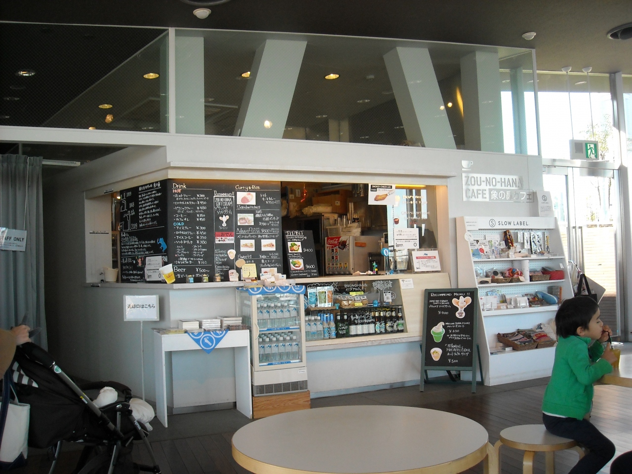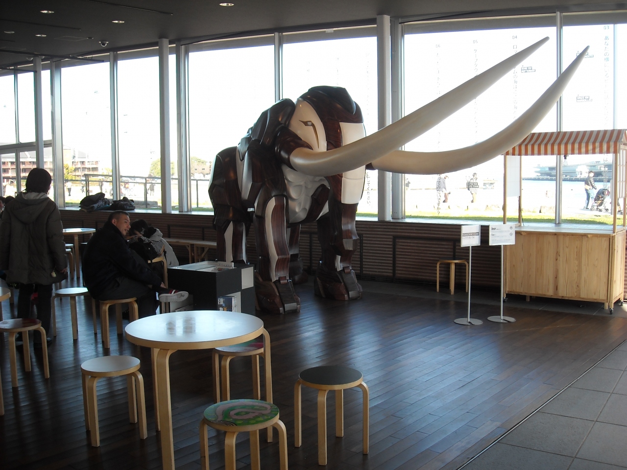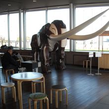 象の鼻というくらいですからマンモスがお出迎え。ガラス貼りですから眺望もよく風を遮り暖かく休憩には最適です。その中にあるカフェは自動販売機のように考えていましたがオリジナルメニューを持ちしかもお手頃価格、人気もあるようでかなりの人が購入していました。