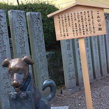 金比羅さんの長い石段の真ん中あたり、神馬のいる広場に建っている西詰銅鳥居の前にこの犬の像があります。金比羅さんへ行けない人が、代わりに犬に代参して貰った風習があったそうです。その姿を少しコミカルな形で像になっています。首にはこんぴら参りと記した袋が掛かっています。