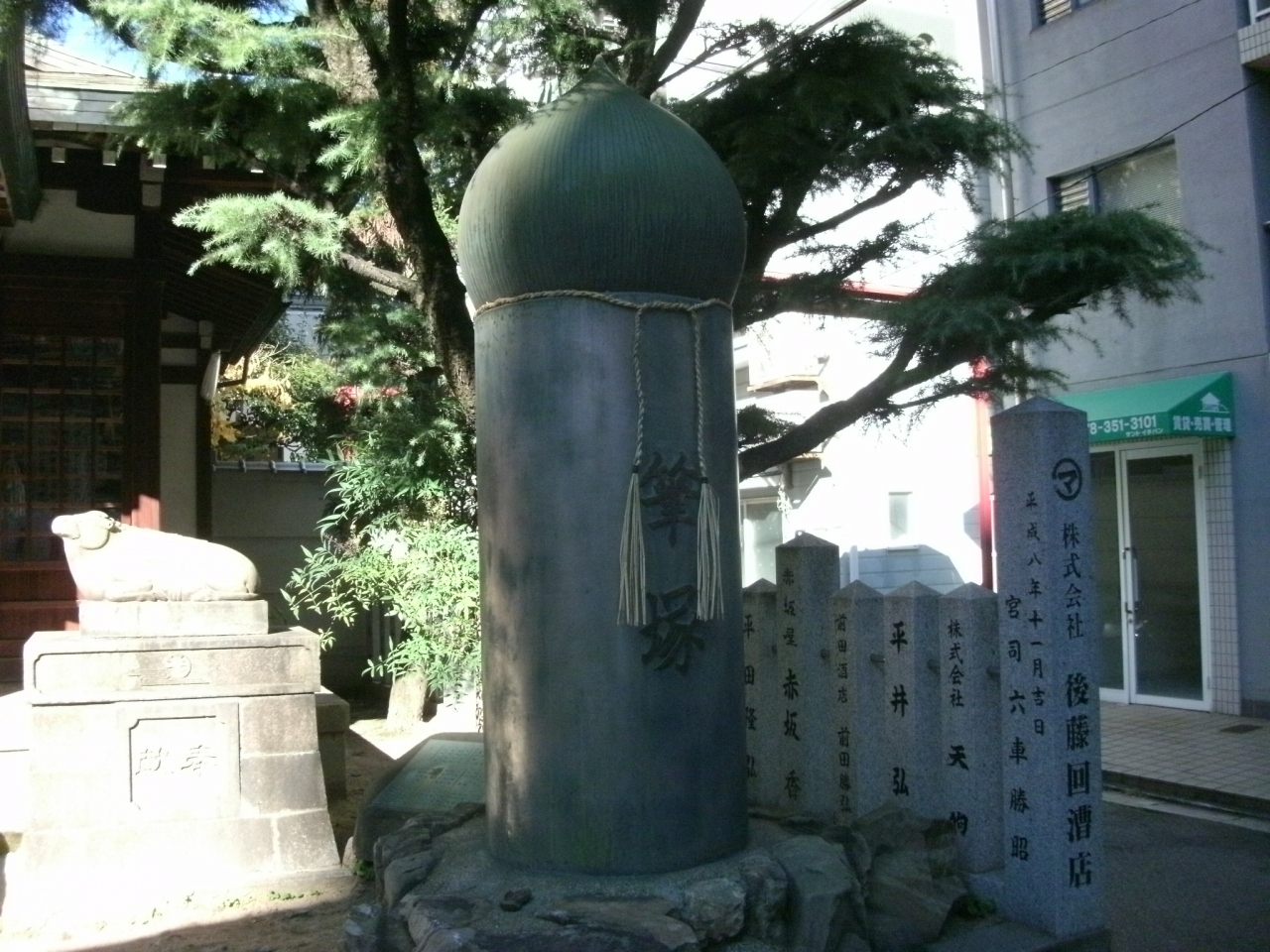 学問・書道の神として有名な菅原道真公をお祀りすることから、筆塚が築かれているようです。高さ2mもあろうかという立派なもので、社殿の前にある狛犬ならぬ狛牛がとても小さく感じるほど、狭い境内にあっては特別な存在感がありびっくりしました。