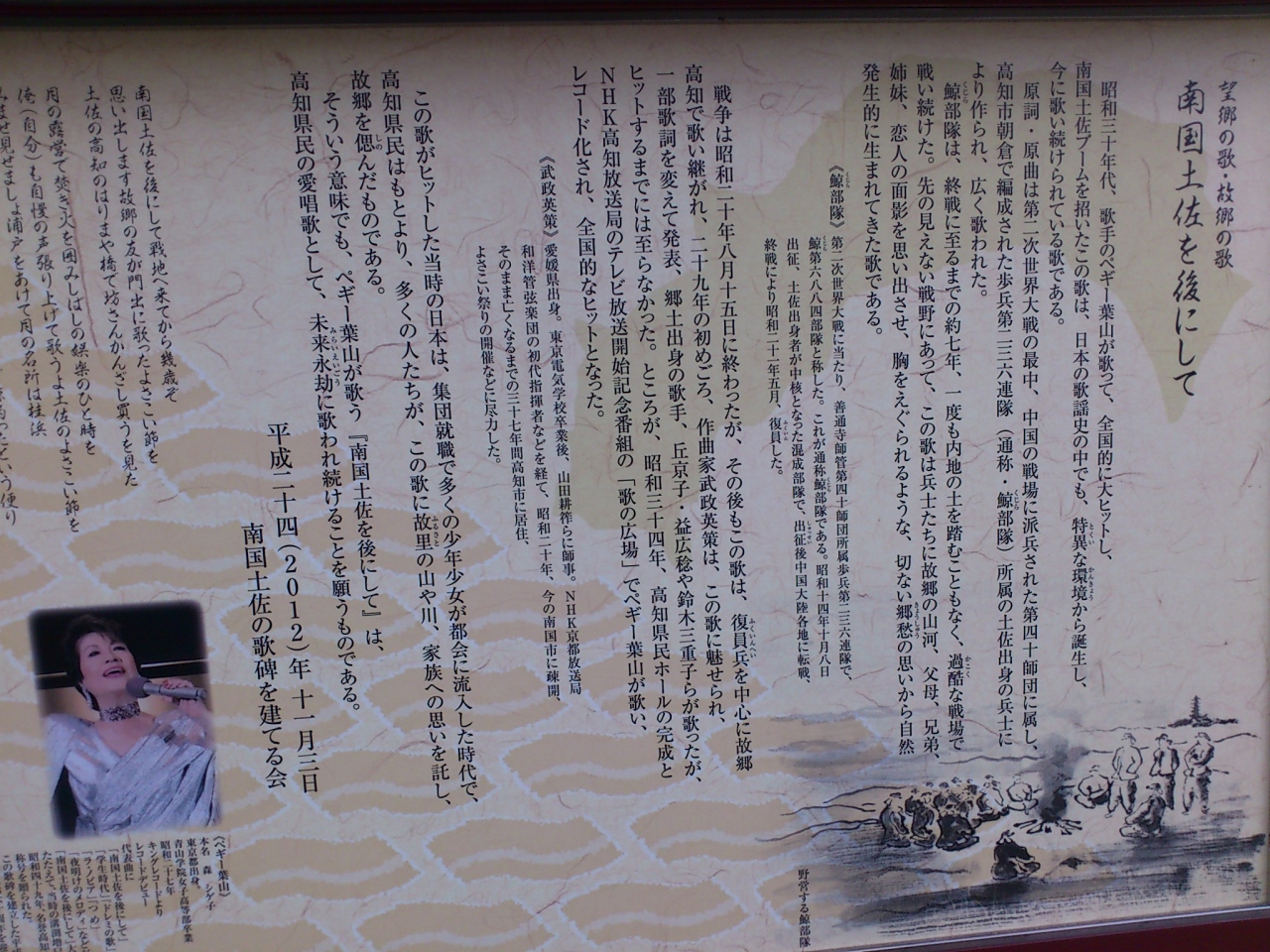はりまや橋の道路の反対側、からくり時計があるデンテツターミナルビルの裏側がはりまや橋公園として整備されていて、そこにイルカのオブジェなどがあります。そのイルカの近くに、ペギー葉山が昭和30年代に歌って大ヒットさせた南国土佐を後にしての歌碑があります。