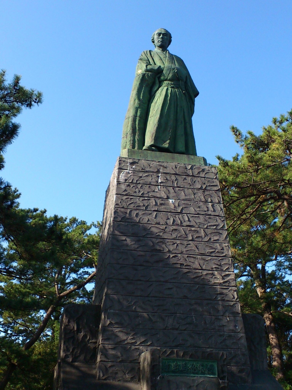 桂浜にある有名な坂本龍馬の銅像です。台風の季節には、ニュースでこの像を何度か見たことがあるのですが、実際の銅像は想像していたものよりも大きなものでした。右手を懐に入れた有名な例のポーズで、遥か彼方の海を眺めています。大きの観光客がここで記念撮影をしていました。