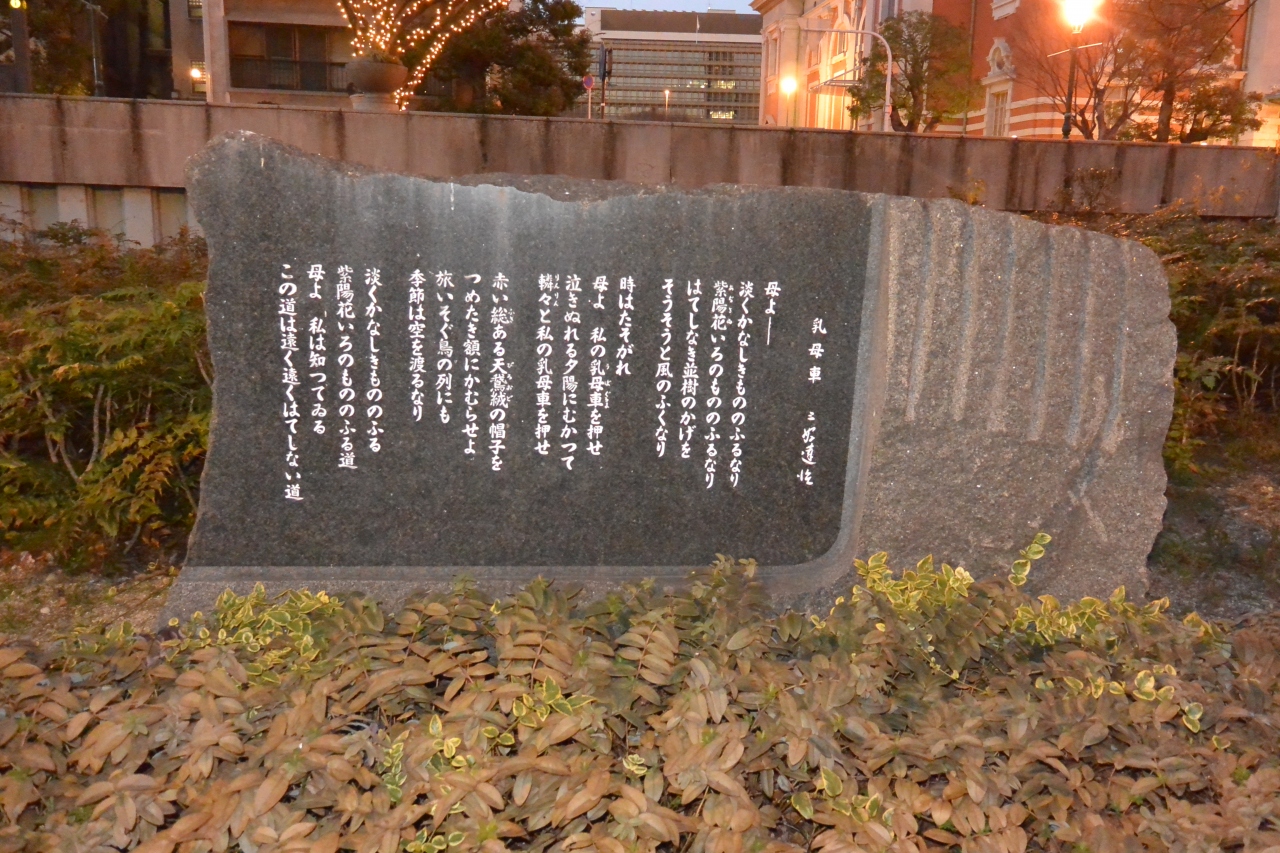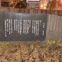 大阪市役所の南側、川沿いの遊歩道脇にあります。詩自体は、詩などにあまり詳しくない私でも知っている有名なものですが、三好達治は大阪市西区出身なので、なぜ生まれた場所ではなく中之島に歌碑が設置されたのかはわかりません。