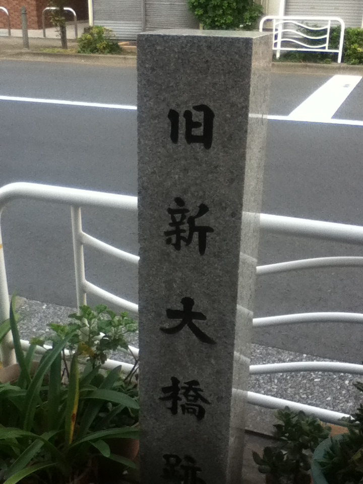 JR両国駅の南西、芭蕉記念館前の大通りの歩道にこちらの石柱がある。週末午後、近くの歩道は散策の人がかなり歩いていたが、こちらの石柱を見ている人はいなかった。石柱はあまり高くないが、名称がくっきりと刻まれていた。石柱のみなので観光要素は少ないが、旧新大橋は元禄6年(1693)、この地先の墨田川に架設したもので長さ百間幅員三間七寸あった。また芭蕉が2つの句を詠んだ。橋梁やこの界隈に関心や知識のある方は、訪問するのもいいかもしれない。