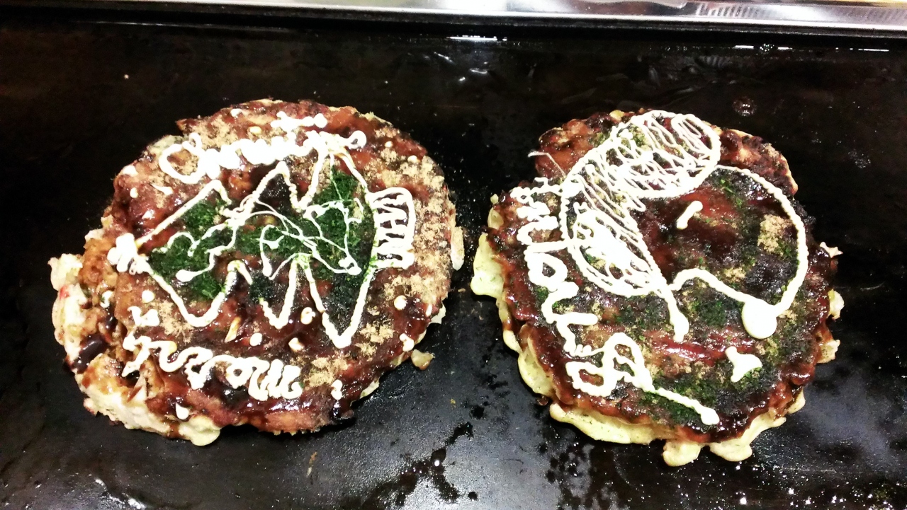女将さんにお願いすると、お好み焼きに、マヨネーズでキャラクターなどの絵をかいてもらえますので、お気に入りのキャラクターがあれば、お願いしてみてはいかがでしょうか。