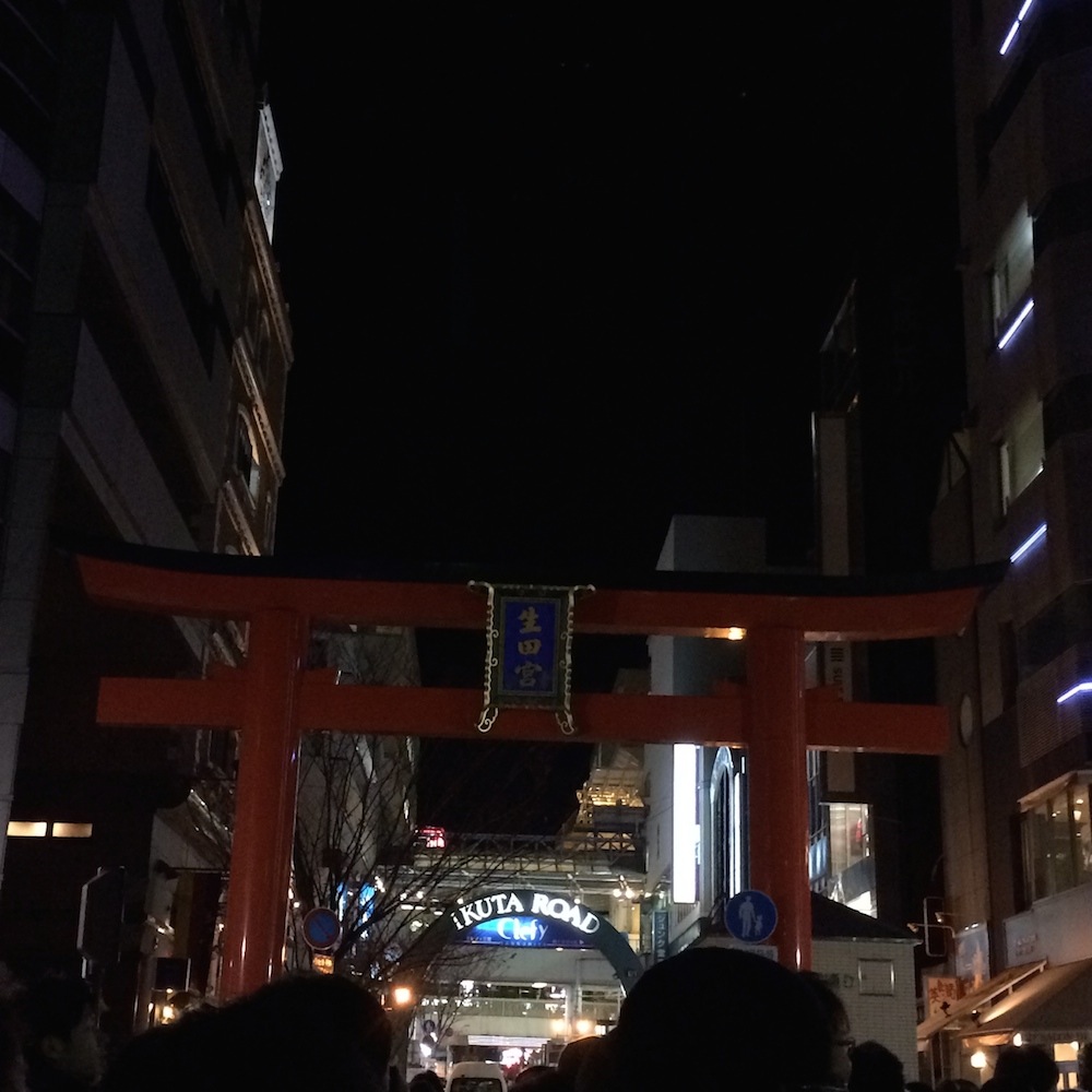 生田神社の参道いくたロード。近くに生田新道がありますが、あちらは東西を走る道で、こちらいくたロードは南北のラインです。ルミナリエの時はここも並ぶコースになっているので、ものすごい混雑に。普段も、週末を中心に混雑する通りです。