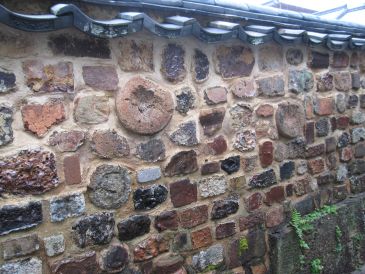 立派な商売家が並ぶ大通りとは違い、裏通りには廃品を再利用した塀の道がこの地方の特徴として観光客を楽しませている。
