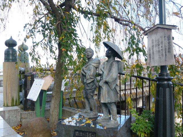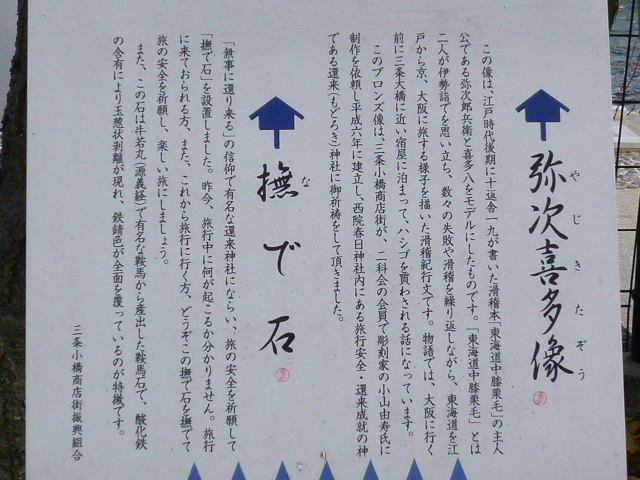 京都の主要な街道としての人の往来が絶えない三条大橋は十返舎一九の「東海道中 膝栗毛」の主人公の弥次さんと喜多さんは橋の袂にあります。この像は三条小橋商店街振興組合が建て、旅の安全を祈願して撫で石と共に設置されています。どんな思いで京の街を二人は眺めているのでしょうね。愛嬌のある顔立ちがとても印象的です。