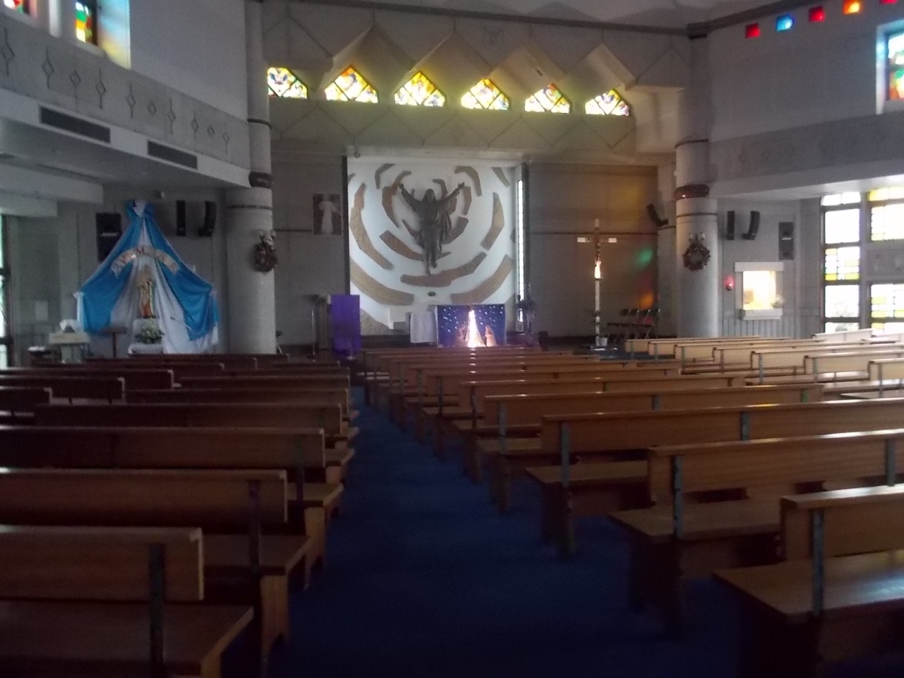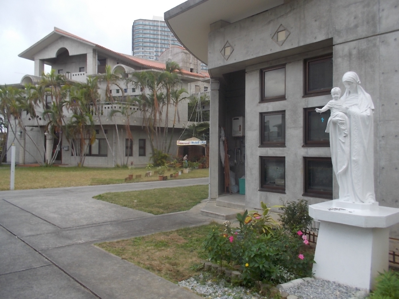 ゆいレールでは「おもろまち駅」でDFS側に降りて、階段を下りて交差点を渡ると右側が教会の入り口です。 車でも駐車場が広いので、いつでも駐車できますし、日曜日のミサが行われていない時でしたら、いつでも教会堂内に入れます。 沖縄では一番大きな教会だと思います。 ステンドグラスがとても綺麗な教会でした。
