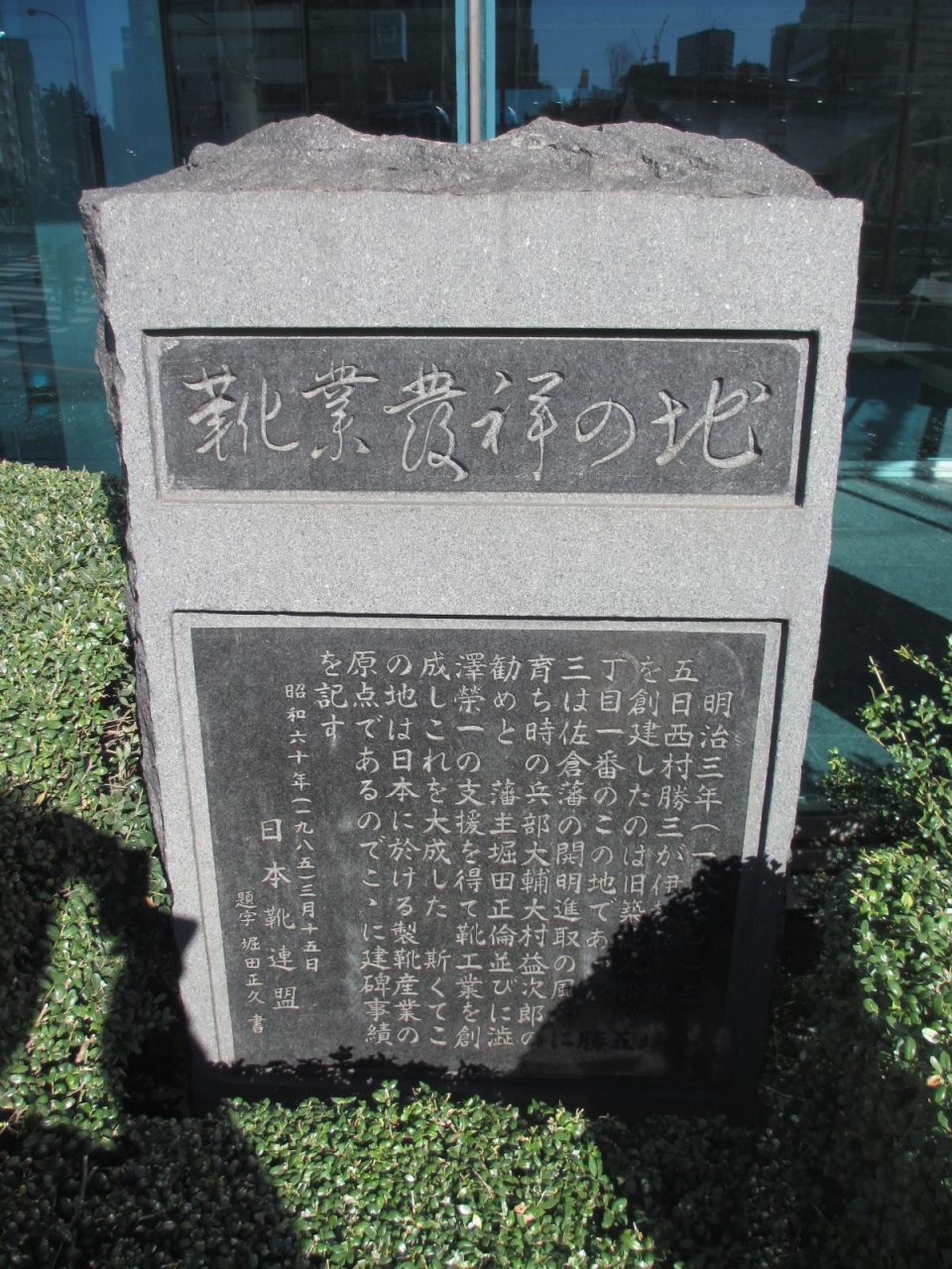 東京メトロ有楽町線の新富駅7番出口を出てすぐ、イトーキ東京本社が入っているビルの前にあり碑には説明文も書かれています。このあたりが、製靴産業がうまれた場所だそうで、今の周辺の環境からするとすごく意外な感じがしました。