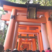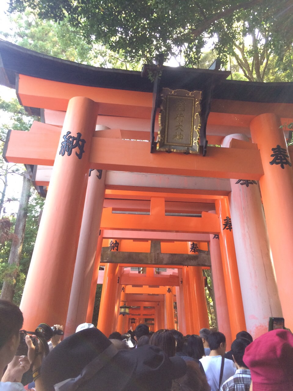 幻想的な赤い鳥居が続きます。有名な観光地なので、様々な人が訪れていました。みんな記念写真を撮るので、渋滞が発生します。これも名物です。太陽の光が木漏れ日のように隙間河差し込んで、赤い色がさらにきれいでした。
