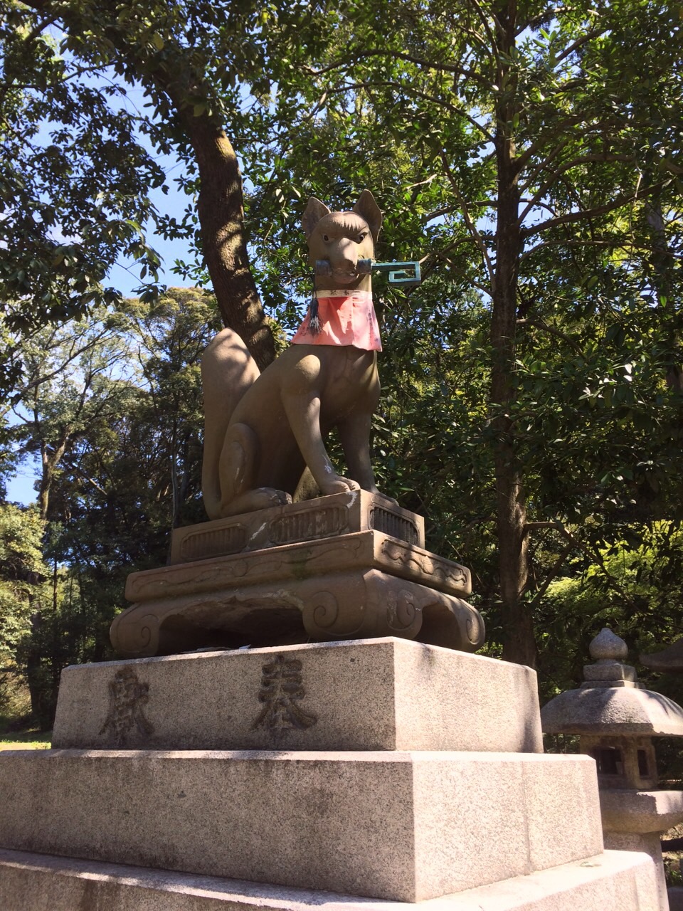 たくさんのキツネがいるので、1体1体よく見てみることにしました。このキツネは、カギをくわえていました。もう一方は玉をくわえていました。巻物をくわえているキツネもいました。観察してみるといろんな形がありました。