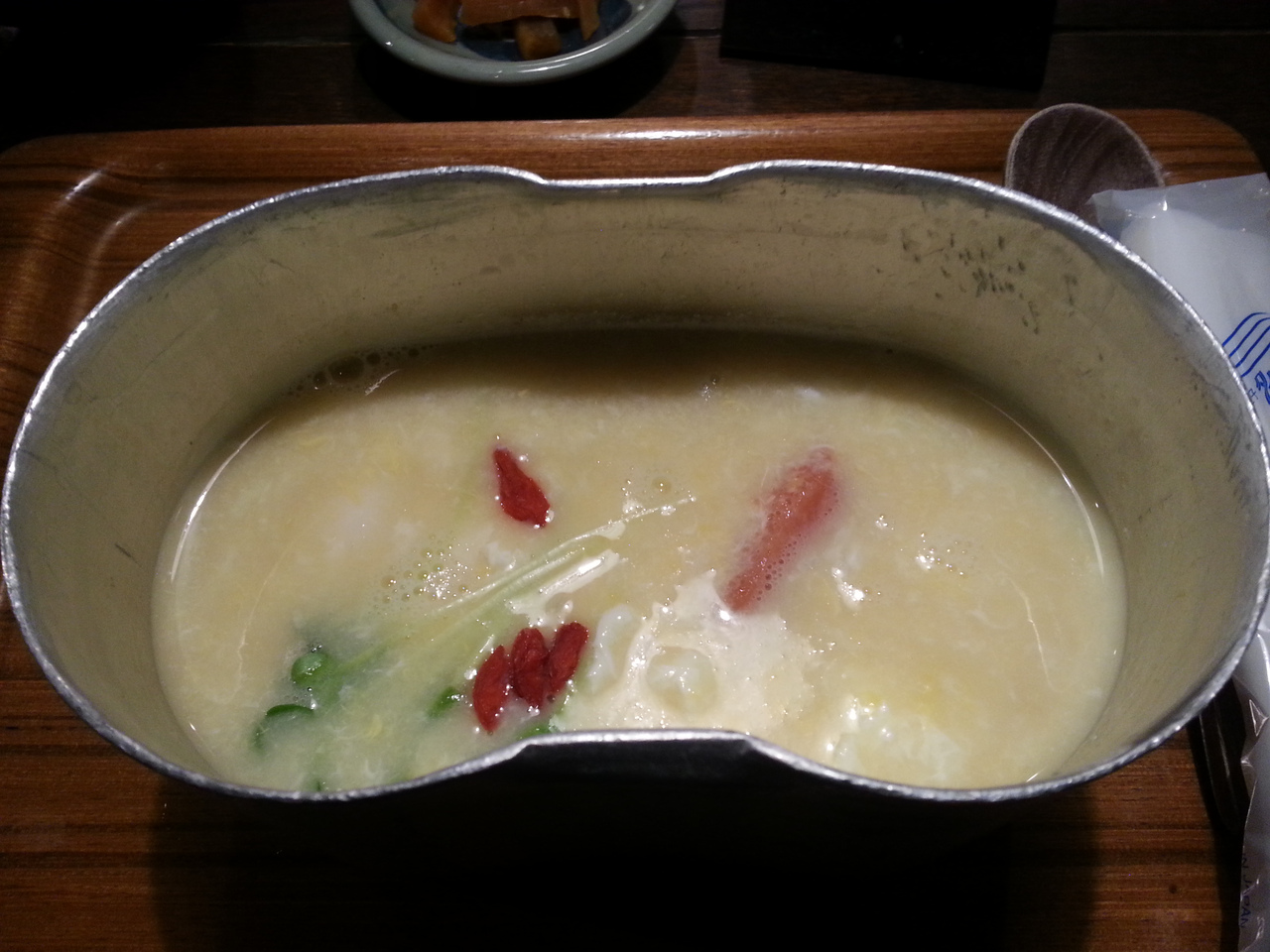 一度行ってみたかった「はんごう雑炊の店」山。はんごう炊きで特色を出しているのはこの店と横浜のキッチンジローが思いつく。何か飯盒で出されることで野性味が加わり、土鍋で提供されるのと違った趣があるので面白い。勿論、雑炊自体もふわっと優しい味。この店の店主もはんごう炊きに思い入れがあるのかな。