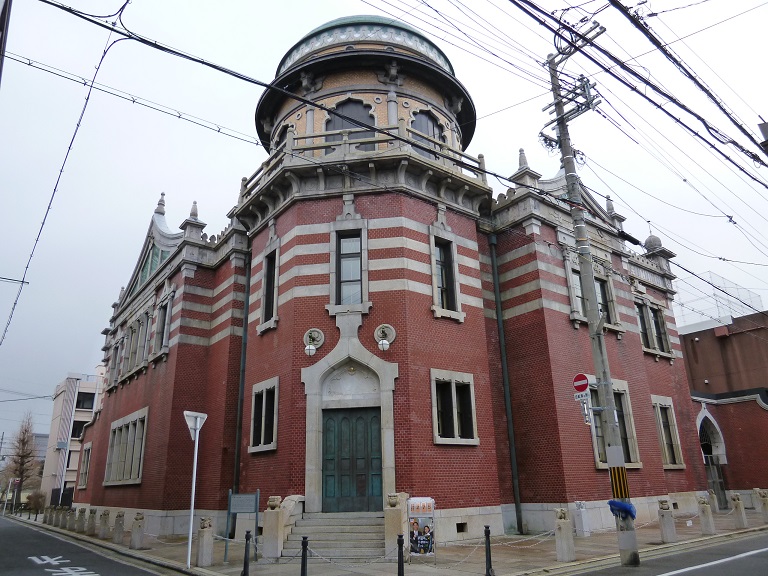 元は明治28年に設立された真言宗信徒生命保険株式会社本館です。場所は丁度西本願寺の正門を背にして道路の反対側に延びる門前町に入り1分ほど歩いたところです。門をでると印象的なドームとレンガ色の壁が目に飛び込んできますから迷うことは無いと思います。