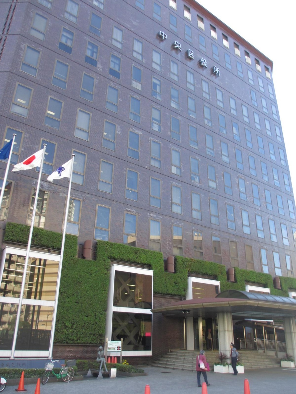 東京メトロ有楽町線の新富駅1番出口を出てすぐ目の前にあります。11階建てで一番見晴らしの良い11階は職員食堂が入っています。区役所自体に特に観光的な要素があるわけではありませんが、このあたりは、江戸時代には土佐藩の領地だったそうです。