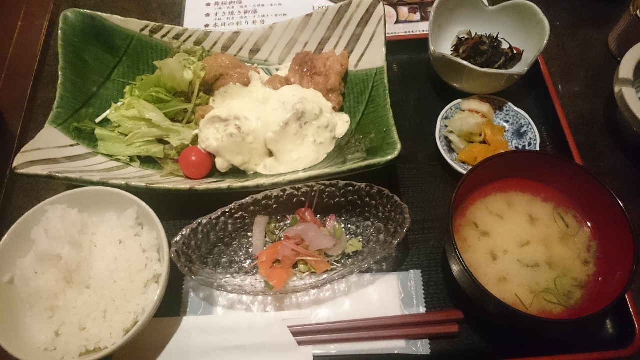 銀座一丁目の飲食店ビルの6階にある個室がある居酒屋のランチ。唐揚げ900円、豚角煮950円、刺身1000円など。日替わりから、鶏南蛮を食べた。カルパッチョ風サラダ、ひじき、お新香、味噌汁、ご飯が付く。鶏南蛮は、大きめで、ボリュームある。