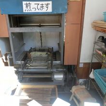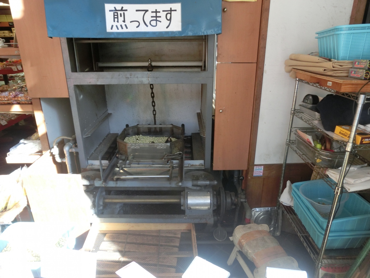 店頭で大豆を煎っている