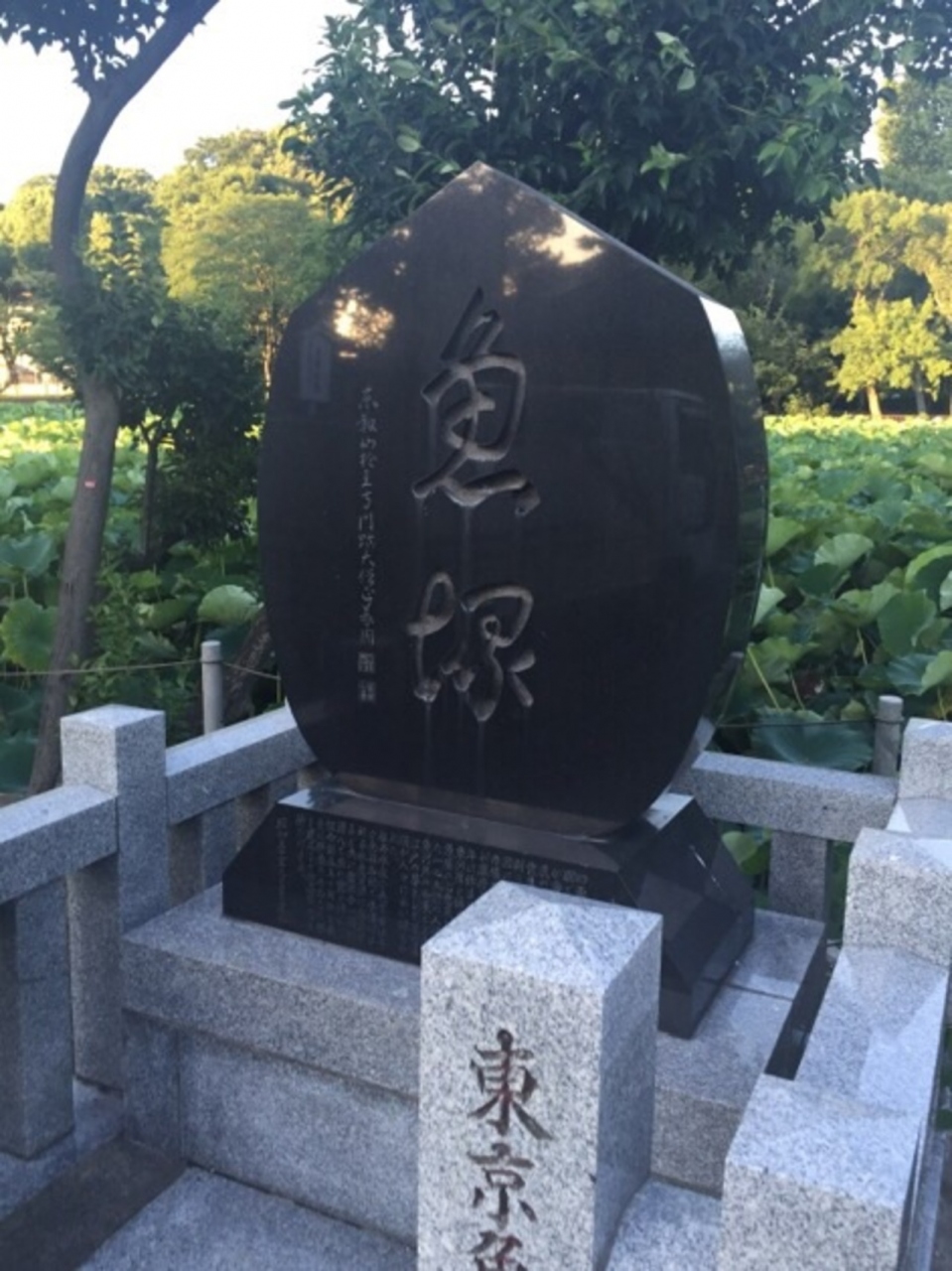 上野恩賜公園内の不忍池の弁天島にある石碑です。昭和51年に東京魚商業協同組合によって建立されたものですが、碑文には水揚げされる水産資源に感謝し慎んで魚の霊を悼み、組合創立50周年を機に供養のためこの塚を建立します。とありますが、海の近くでもないこの場所に建てた理由は不明です。