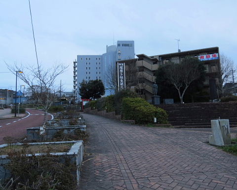 最初は車に乗って場所を探しましたが、見つけにくいので歩いて探したらすぐ見つかりました。JR鹿島駅前の中央付近のレンガ敷の歩道を歩いて上ると、右手に小さな鹿詰公園が見えてきます。マンションらしき建物の前です。「剣聖・塚原卜伝生誕之地」という大きな看板が見えるので、すぐわかります。