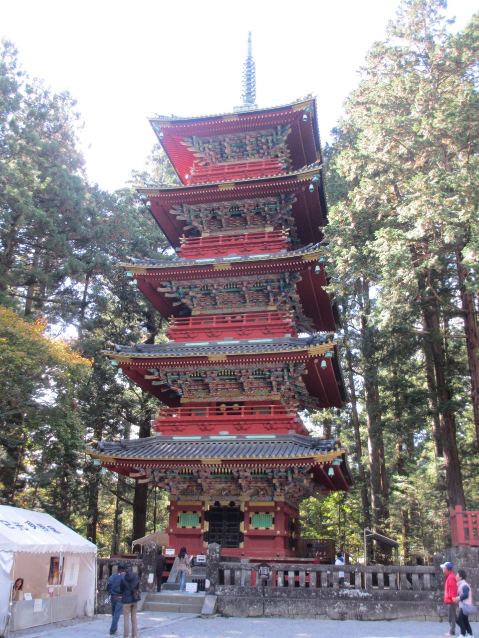 東照宮参道にある石の鳥居を過ぎた左側にあります。一層の屋根下には十二支が彫られています。正面の屋根下には辰、卯、寅の彫刻が彫られています。これは家光、秀忠、家康の干支を表しています。塔の中心にある心柱は、下が地上から10?程浮いていて、地震の揺れを吸収するように造られています。また屋根を支える垂木は、4層までは平行に造られていますが、5層は平行になっていません。何故だか不思議です。