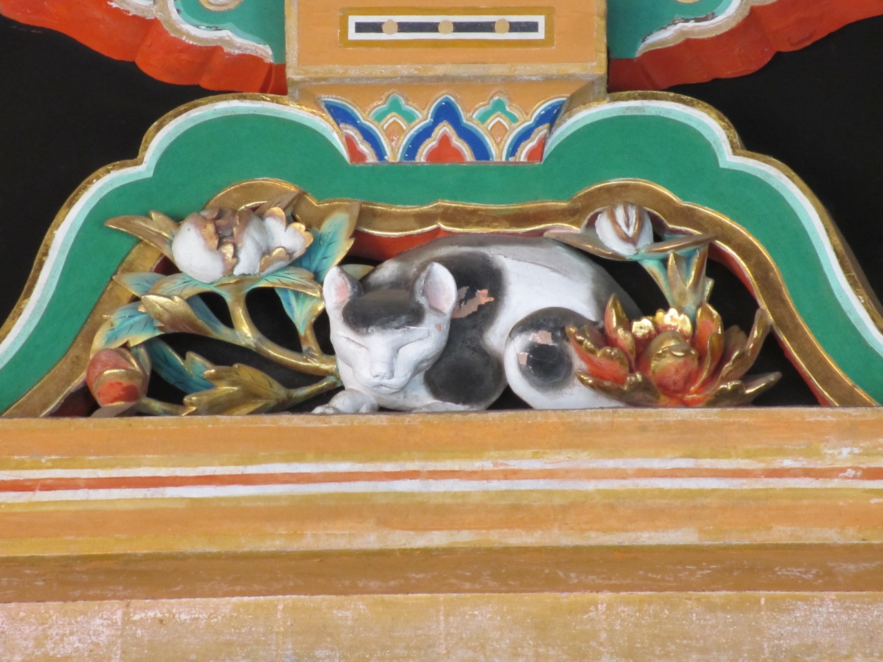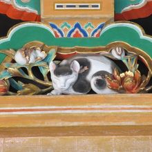 唐門を右手に行ったところにある奥社入口の上に掘られている左甚五郎の彫刻です。東照宮にある左甚五郎が造った彫刻です。見る角度によって威嚇の表情になったり、穏やかな表情になったりします。眠り猫の裏には雀の彫り物があり、猫と雀が共存することから、世の中が平和になったことを表現しています。