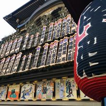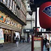 南座建物正面左右手前には、「南座」の名称が入った超特大の赤色提灯があり、この提灯も目印になります。