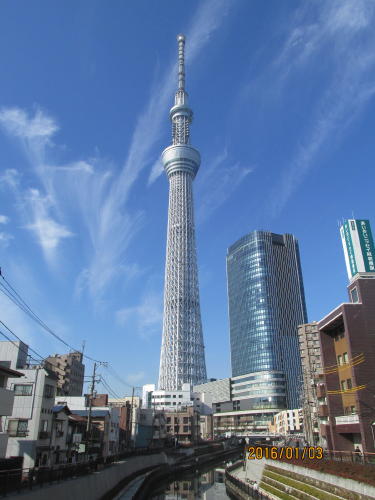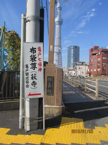 今年の七福神めぐりは東京都江東区にあります亀戸七福神めぐりに行ってまいりました。東武線のスカイツリー駅で下車して、浅草通りを東へ進み北十間川と横十間川の分離する柳島橋を横十間川に沿って南へ下った所に龍眼寺通称萩寺布袋尊があります。以下天祖神社福禄寿、普門院毘沙門天、香取神社大黒神・恵比寿神、東覚寺弁財天、常光寺寿老人を巡りました。六ヶ所で神社が三体、お寺が四体の七福神です。お寺と神社の御参りの仕方が違います、手を叩くのは神社です。間違えないで下さい。歩く道すがらスカイツリーが何処からでも良く見る事が出来ます。途中で亀戸天神と亀戸水神に立ち寄りました。帰りは常光寺から東武亀戸水神駅から電車に乗りました。掛かった時間は2時間、歩数は12000歩、行列に並ばず楽な七福神めぐりです。