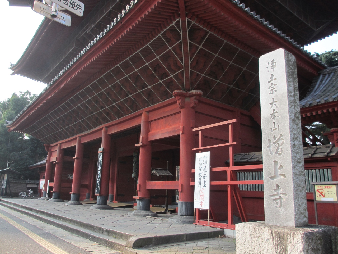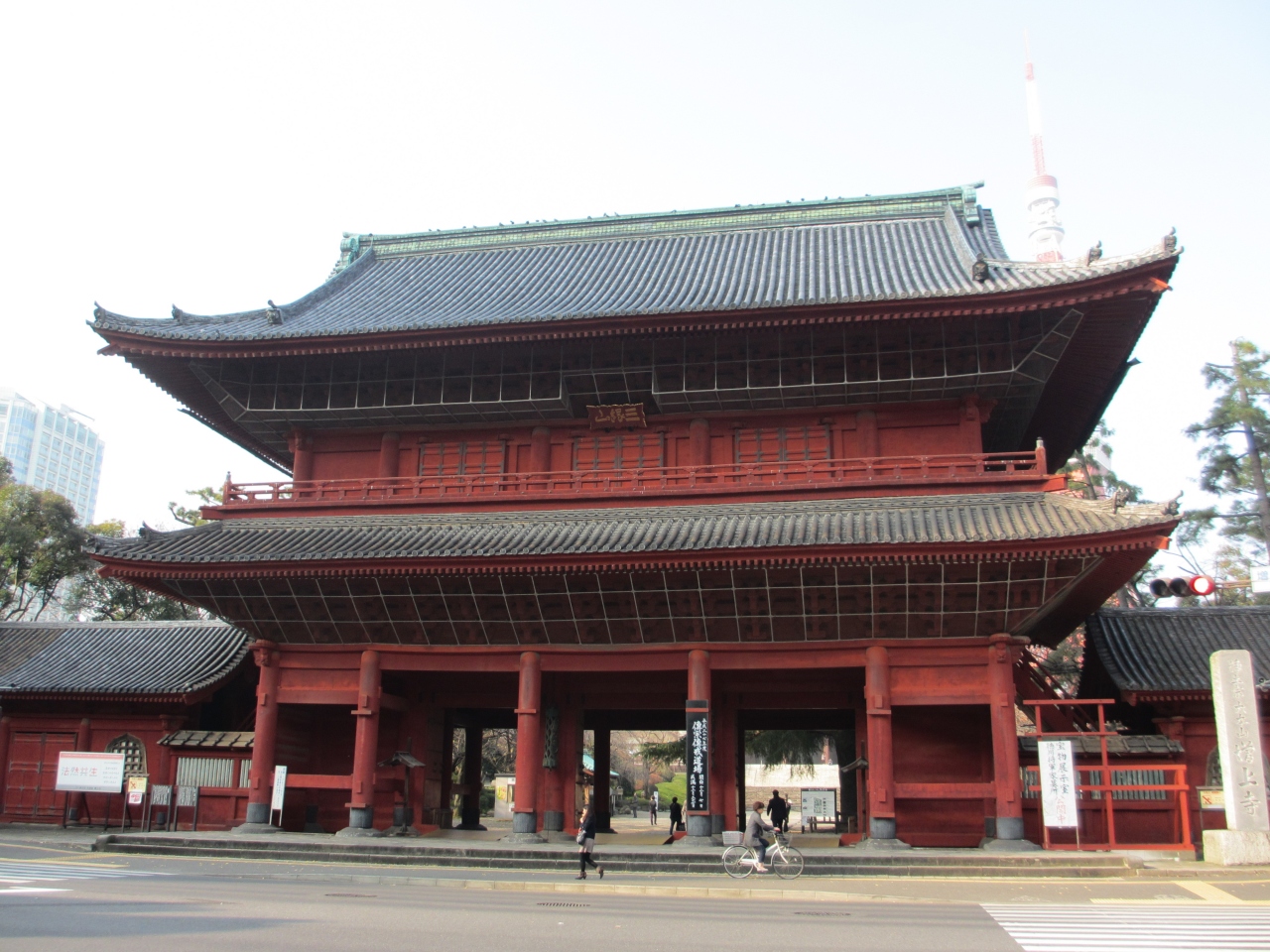 都営大江戸線大門駅から徒歩4分です。1611年に徳川家康の助成により江戸幕府大工頭中井大和守正清によって建立され、1622年に再建されました。増上寺で唯一の江戸時代初期の面影を残す建造物で、重要文化財に指定されています。三つの煩悩、食欲・瞋恚・愚痴の三悪を解脱する悟りの境地を表してます。建築様式は三戸楼門、入母屋造、朱漆塗です。大門からの道の正面です。