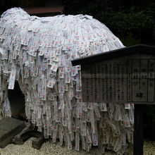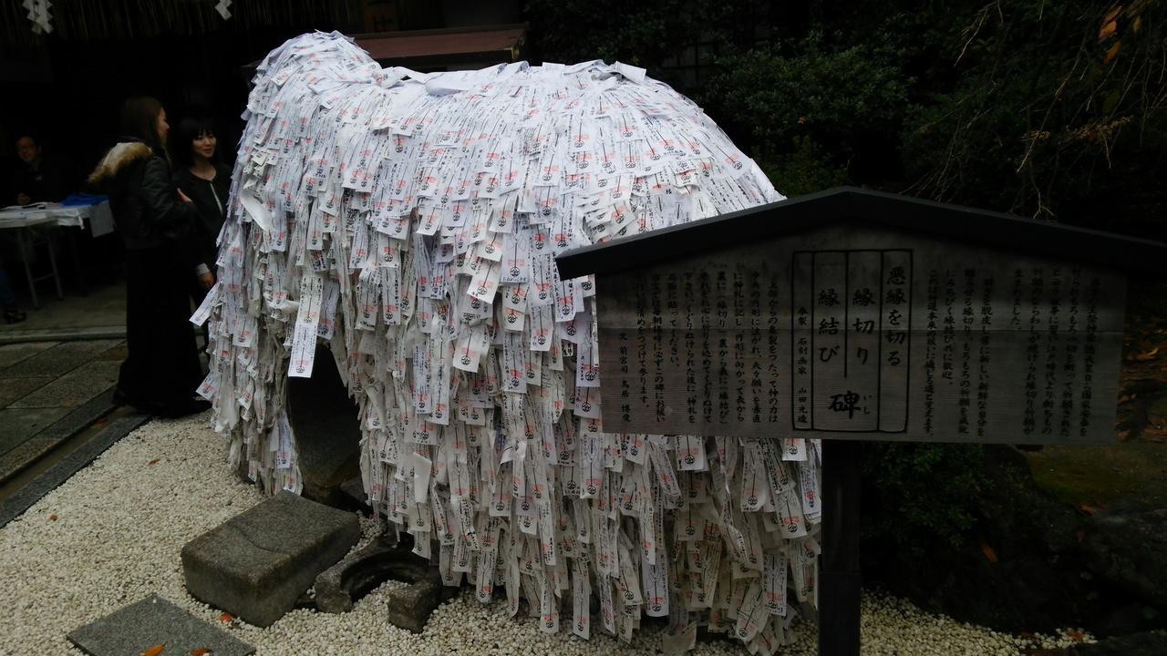 形代というお札を頂き、切りたい縁、結びたい縁をその紙に書き、穴をくぐったあと、碑に貼るのですが、碑が見えないほどその紙で埋め尽くされています。