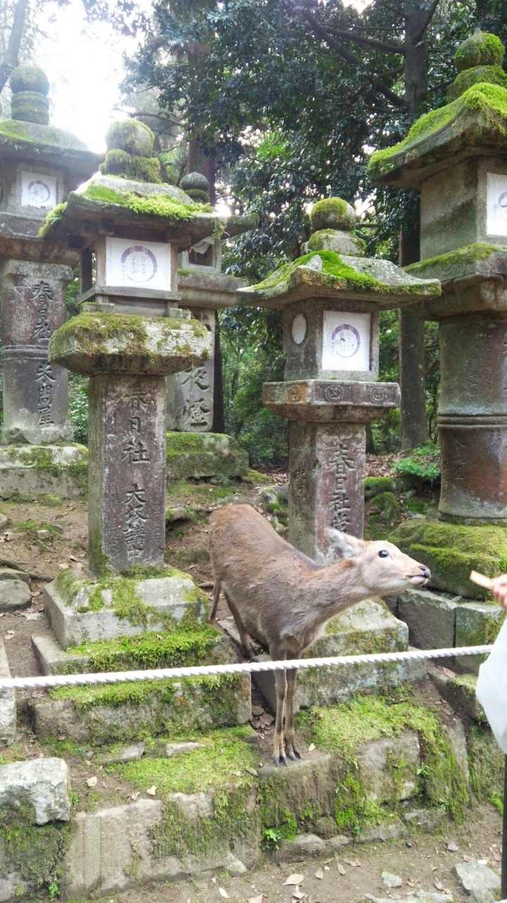 可愛らしい鹿たちがお出迎え(?)してくれ、苔むした燈籠がなんとも風情がありました。