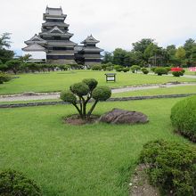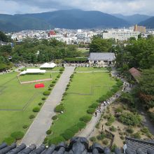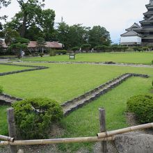 松本城の黒門を潜ると天守の前に本丸庭園が広がります。その芝生の上に瓦で仕切られた部分が本丸御殿の跡です。本丸とは城主の住む館です。訪れた日は連休だったためなのか、本丸庭園には入れませんでした。天守から本丸庭園を見下ろすと御殿の形が分かります。