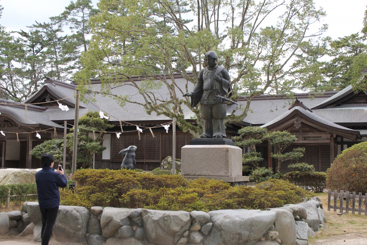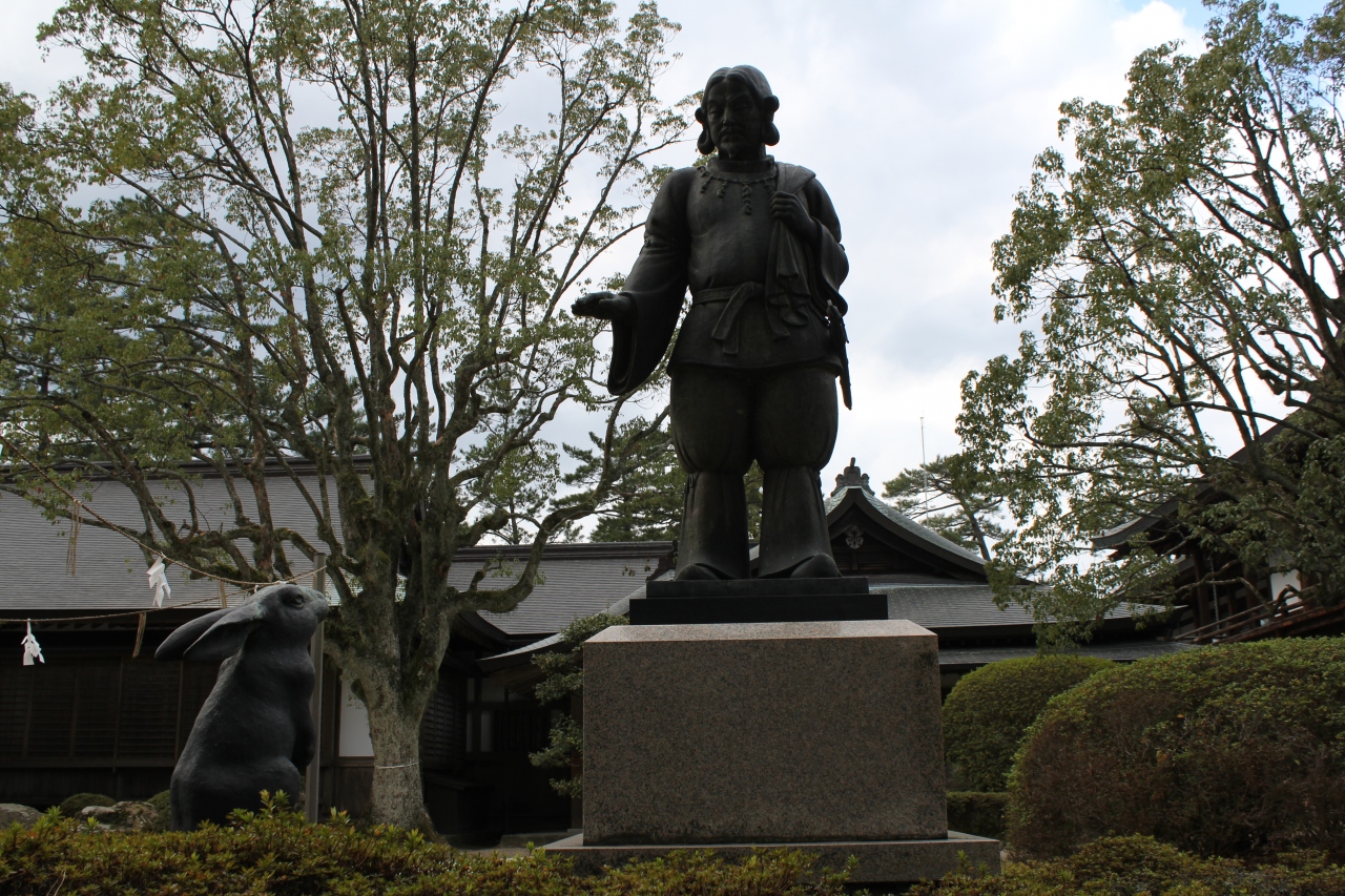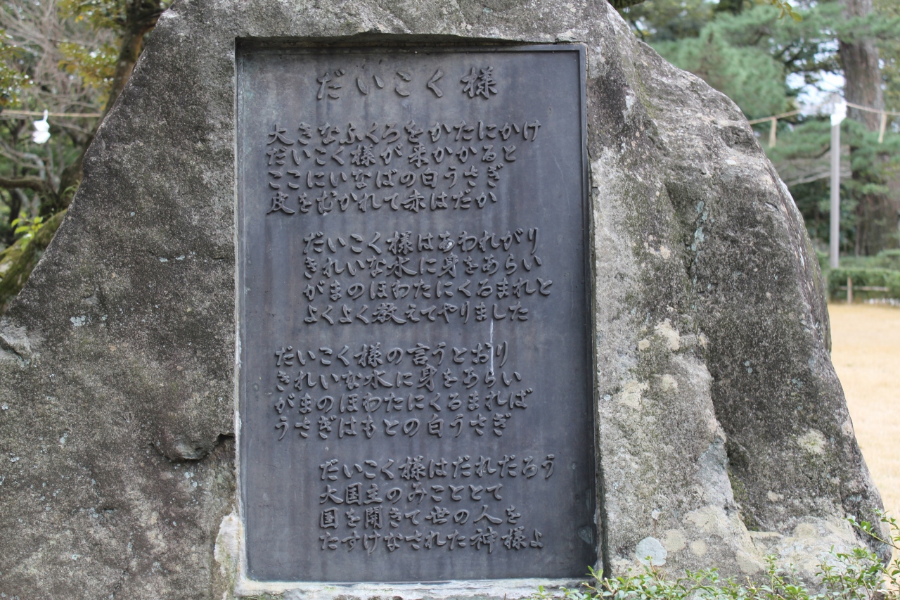 2016年初に出雲大社へお参りに行きました。出雲大社の鳥居をくぐり松の馬場の右側を人の流れに乗って歩いて行くと出雲大社神殿手前左側にありました。因幡の白うさぎが皮をむかれ哀れに思った大黒さまが助けてくれたそうです