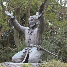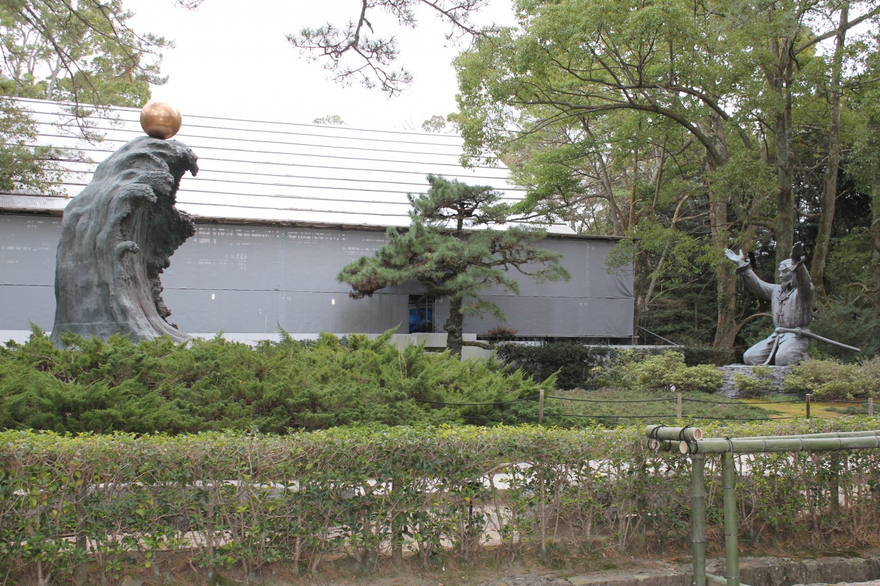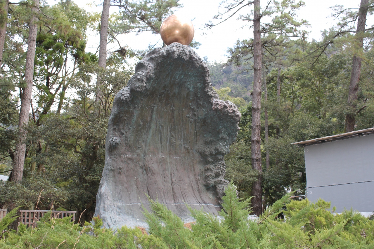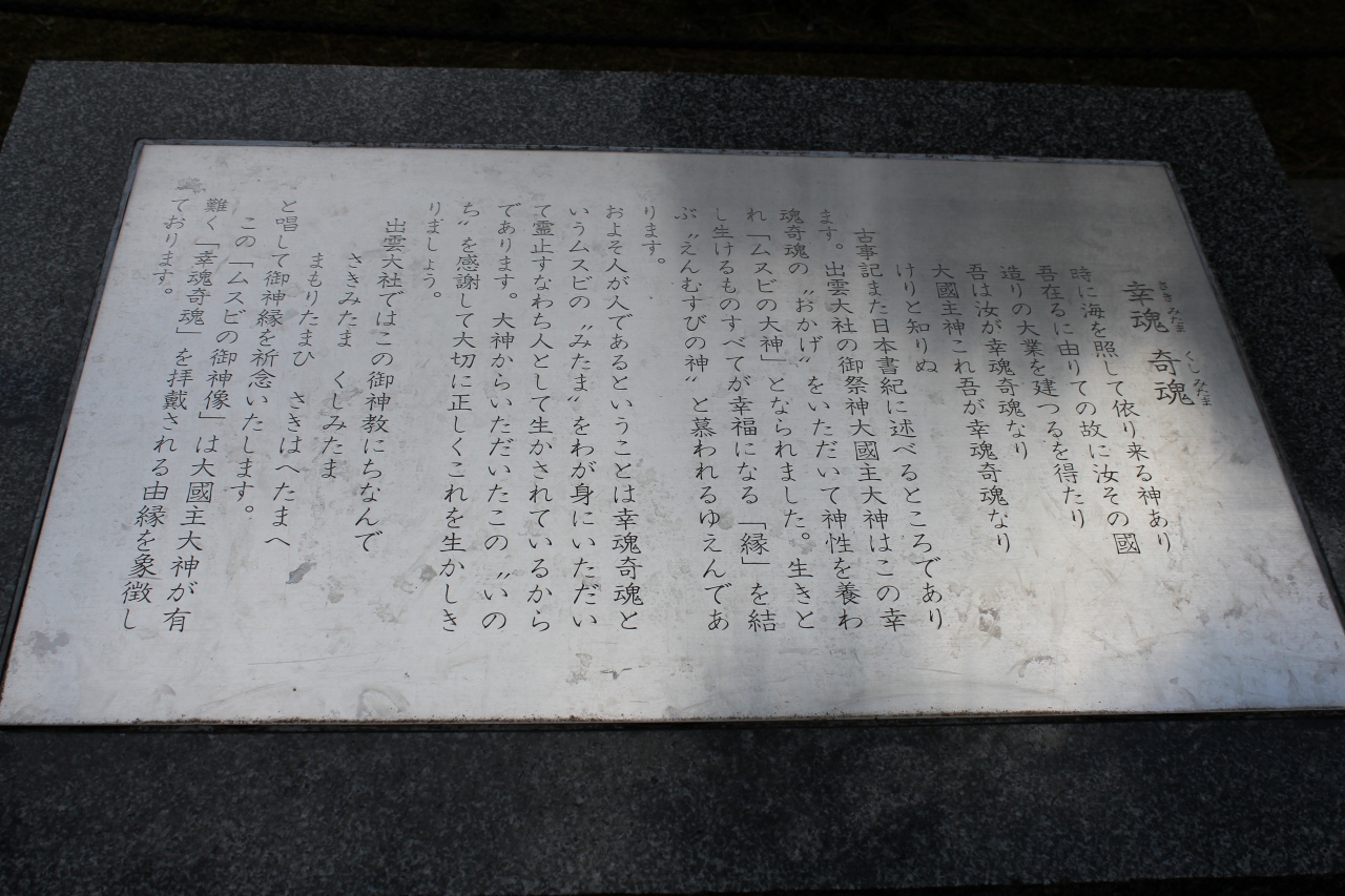 2016年初に出雲大社へお参りに行きました。出雲大社の鳥居をくぐり参道を歩いて行き、本殿手前の右側にありました。大国主神と兎の像の反対側です。とても大きな像で迫力があります。皆さん必ず足を止めて見ていました