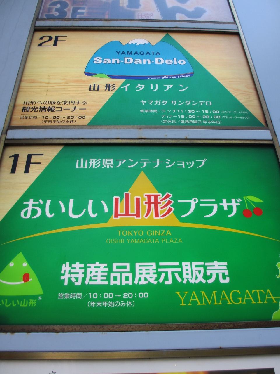 銀座一丁目駅から徒歩1分です。柳通りに面してます。1階店頭で野菜を、店内は山形産の食品・酒などが売ってます。2階は山形の食材をイタリアンで山形の素晴らしさを伝えてます。ランチはコース1850円~、ディナーコースは6000円~です。1階売り場は人気がありますが、2階レストランは日曜日12時半には満席でした。