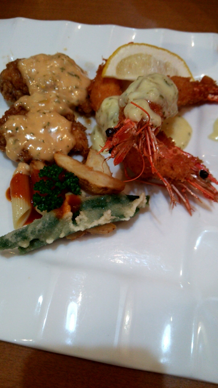 チキン南蛮とエビフライのセットとハンバーグを頼んだが、セットのコーンスープは、いかにも業務用って感じで普通です。チキン南蛮は、ソースが酸味があり美味しい。驚いたことに、ハンバーグは手ごねでした。その味は、塩辛くなく、柔らかくジューシーで、理想のハンバーグでした。チキン南蛮は想定内でしたが、このハンバーグは、予想外の出来だったのでまた食べに行きたいです。