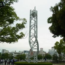 平和記念資料館からみて公園の一番奥に位置しています。元安川を挟んで原爆ドームの向かい辺りにあります。その形は、世界人類を象徴した直径2mの球体を平和都市ヒロシマの市民の深い祈りの手と、苦難を超え、無限に伸びていく平和への希望を表した高さ20mの鉄塔3本で支えています。
