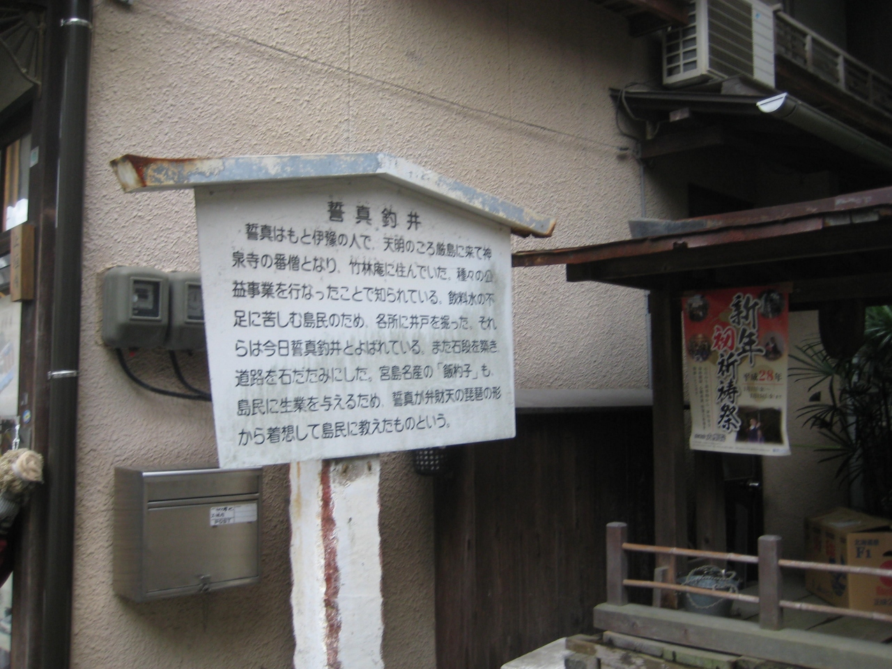 島内を右往左往し、道に迷っていたところに、看板があり発見した名所。静かな住宅街にあり、狭い路地の中にひっそりと存在していた。神社や商店街には多くの人であふれていたが、この場所には地元のおばちゃんがいただけだった。看板があったのでどういうものかわかったが、なかったら井戸みたいのがあるなーで素通りしてしまいそうだった。ただ、こういうところにあるものも名所として大切に残され、保存されているのは素晴らしいと思った。