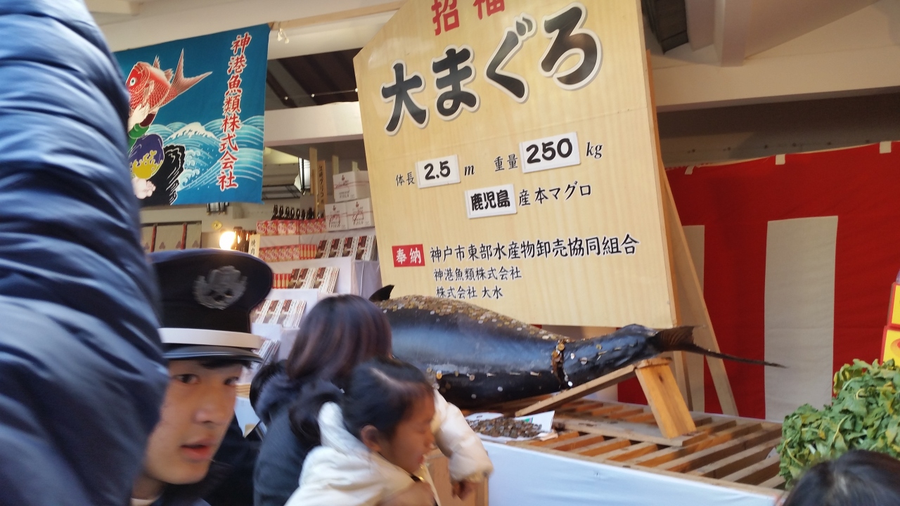 例年通り、大マグロが奉納され、福娘が売る福笹にもたくさんの人だかりができていました。また、こちらも例年通り、境内だけでなく阪神西宮駅までの道路にたくさんの屋台が出店しにぎわっていました。