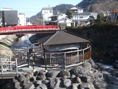 現在は桂川の中に組まれた岩の上に東屋風の屋根があって、足湯として使われています。「温泉法上の温泉ではないので浸かることは出来ません」と注意書きがあります。