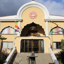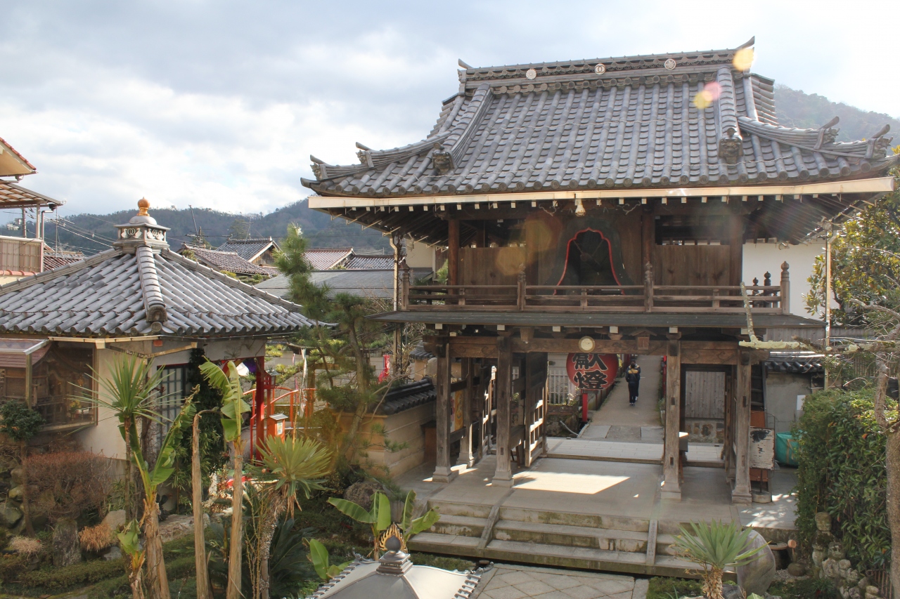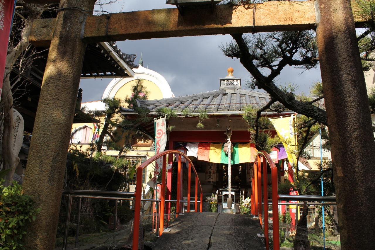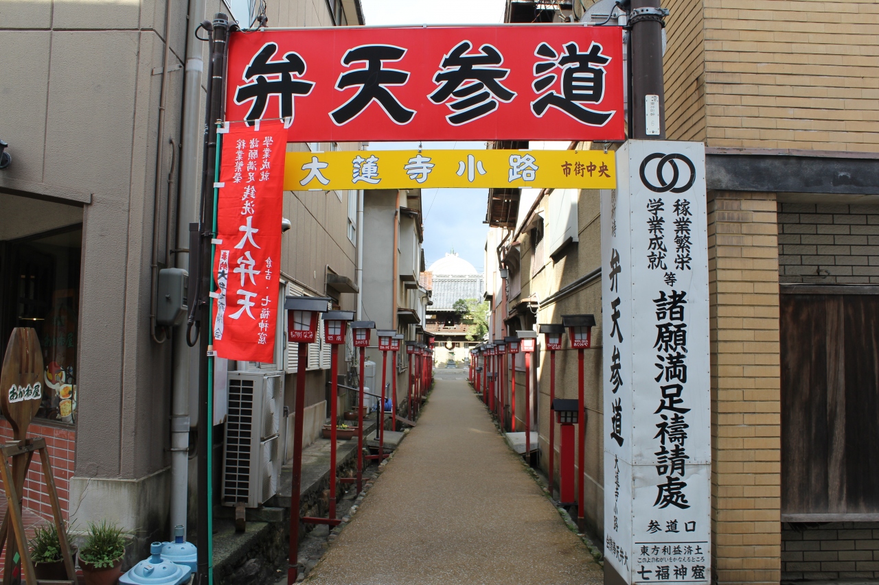 倉吉の白壁土蔵群を散策しました。弁天参道と書かれた看板が目に入り足を止めて見ると大連寺小路とあり、両側に赤い街灯が並ぶ通りを進むと突き当たりにありました。山門は普通のお寺ですが中にある本道はインドの寺院を連想させる建物でした