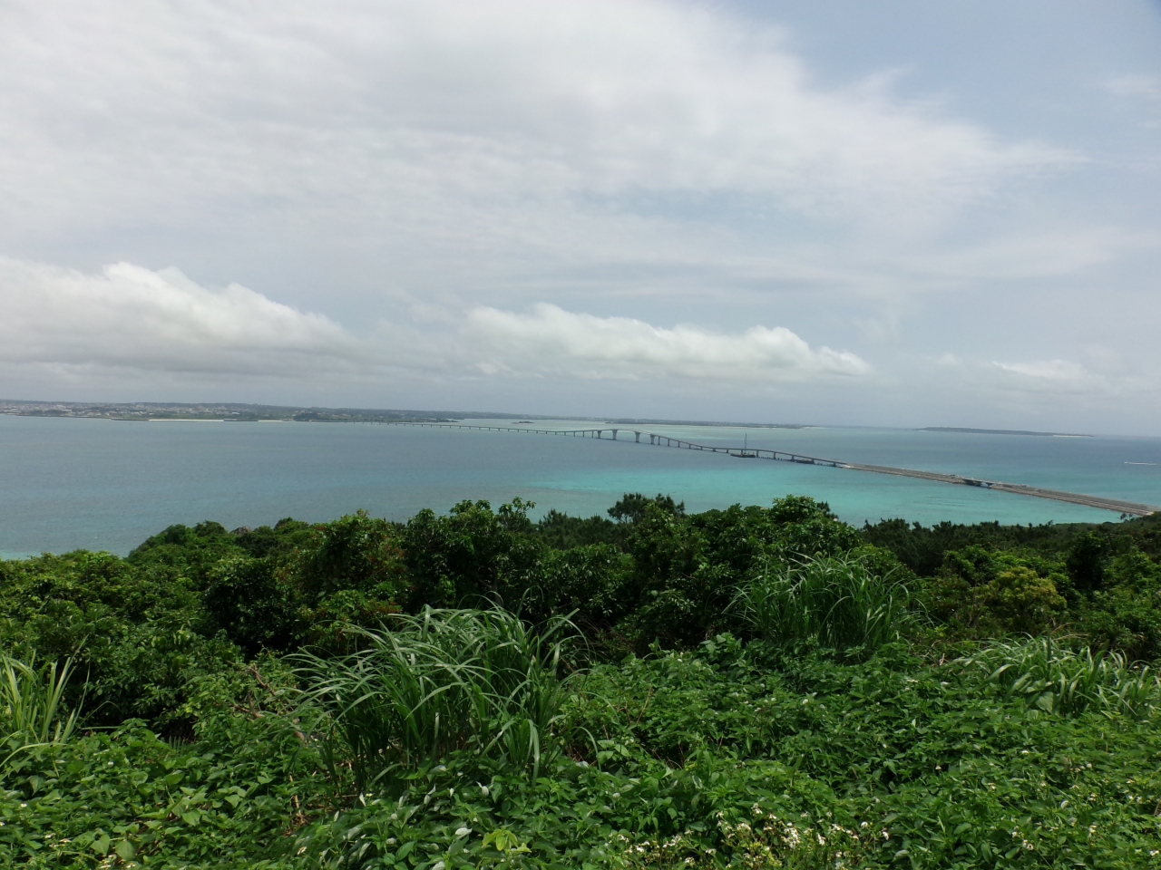 伊良部島外周道路から少し海岸線から離れた場所に位置する広大な牧山園地の中に位置する展望台です。駐車場から離れているため、少し歩く必要があります。宮古島と伊良部島間の航路があった時分には、この牧山展望台にある旧伊良部町の町鳥?サシバ?を幾何学的に形取った展望台を望むことができ、そのことで伊良部島へとやって来たことを知ったように思われていました。平成27(2015)年の伊良部大橋の開通により、橋の?曲がり方?の関係でその展望台が橋上から見えなくなったのは少し残念です。しかし架橋によって来島が容易になった伊良部島の観光地のひとつとしてこの地を訪れる観光客が増え、荒天でもなければ人が絶えることはないようです。