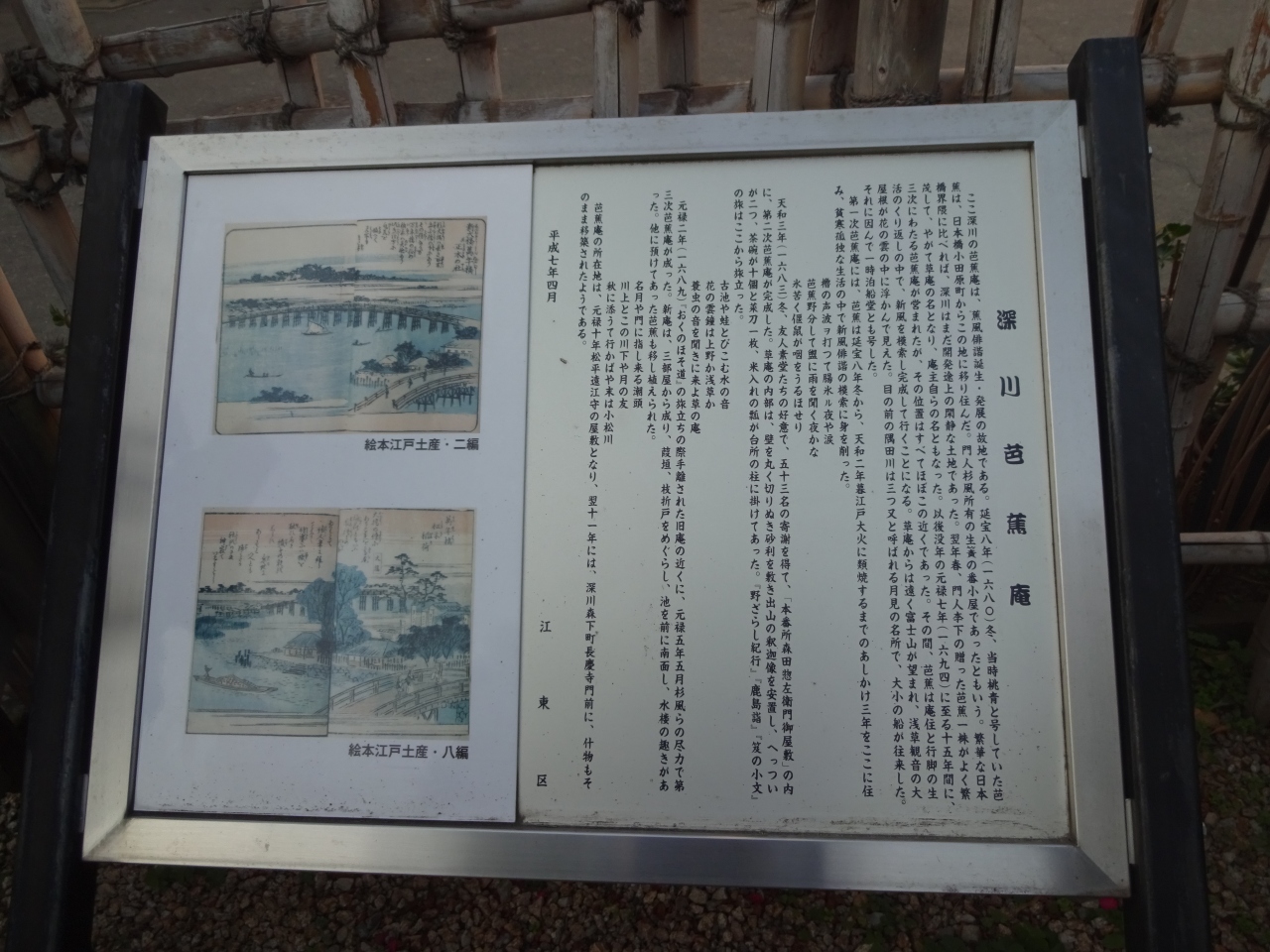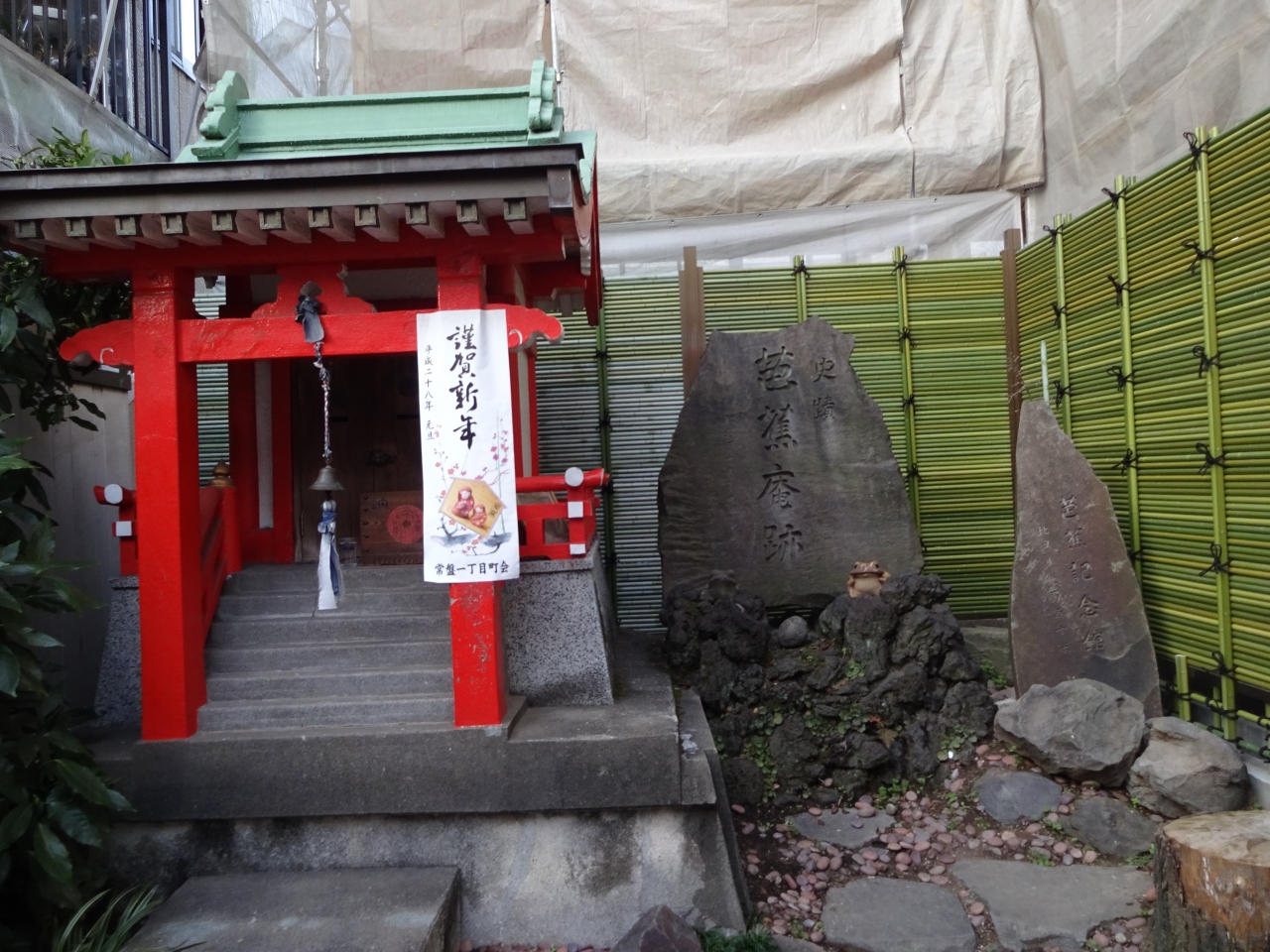 芭蕉庵の跡というのはいくつあるようで、芭蕉稲荷の神社の横にも「芭蕉庵跡」と刻まれた碑が置かれているし、史跡庭園にも芭蕉の名や庵の説明がされている案内があった。