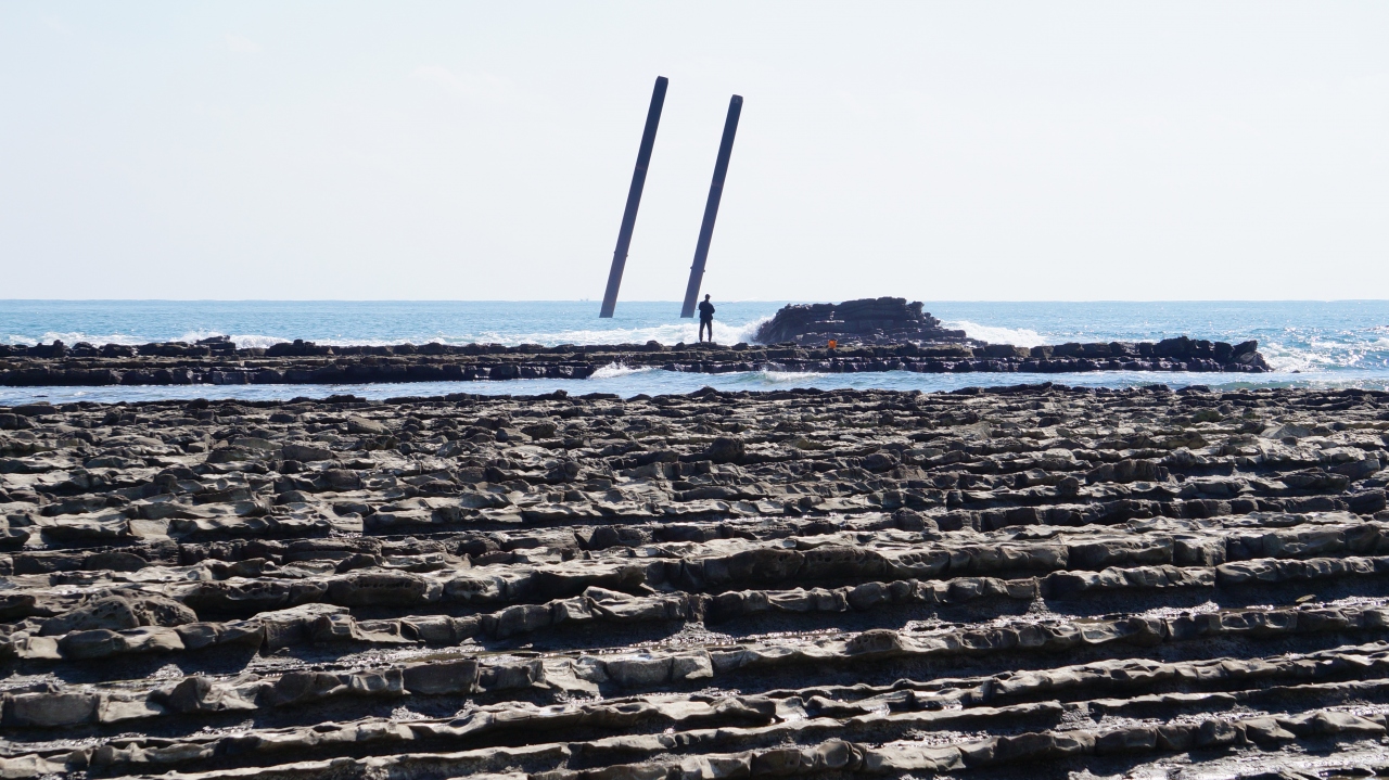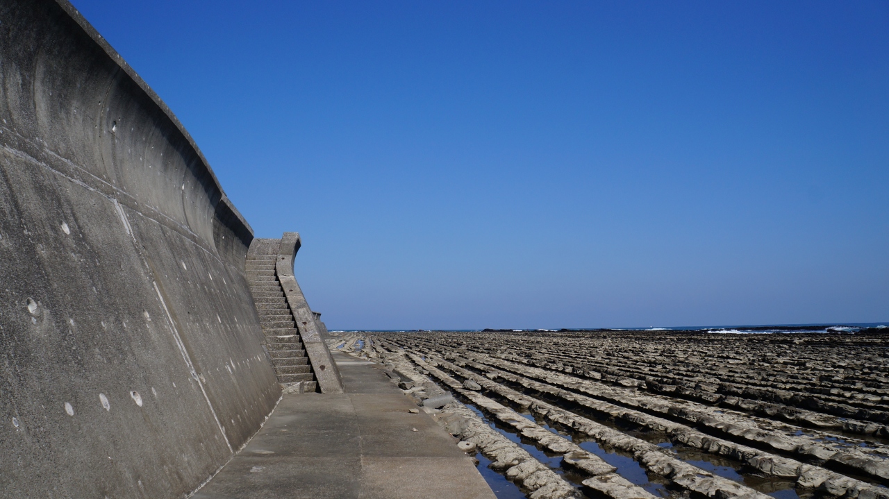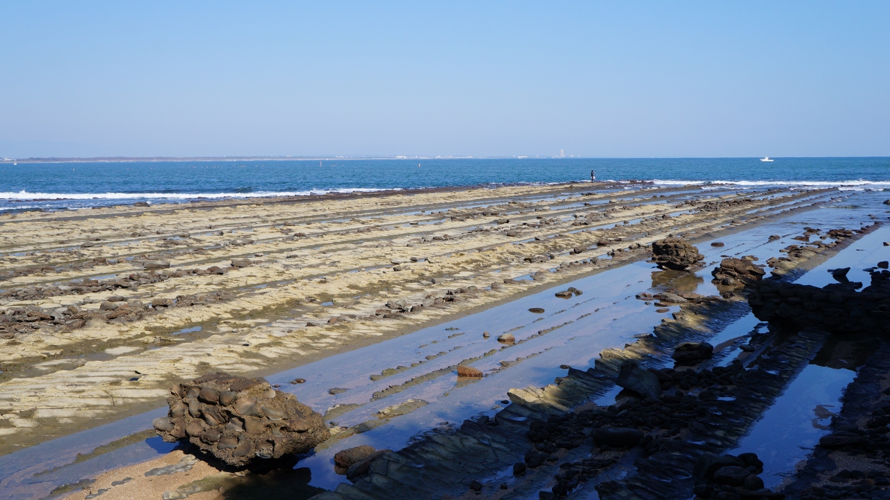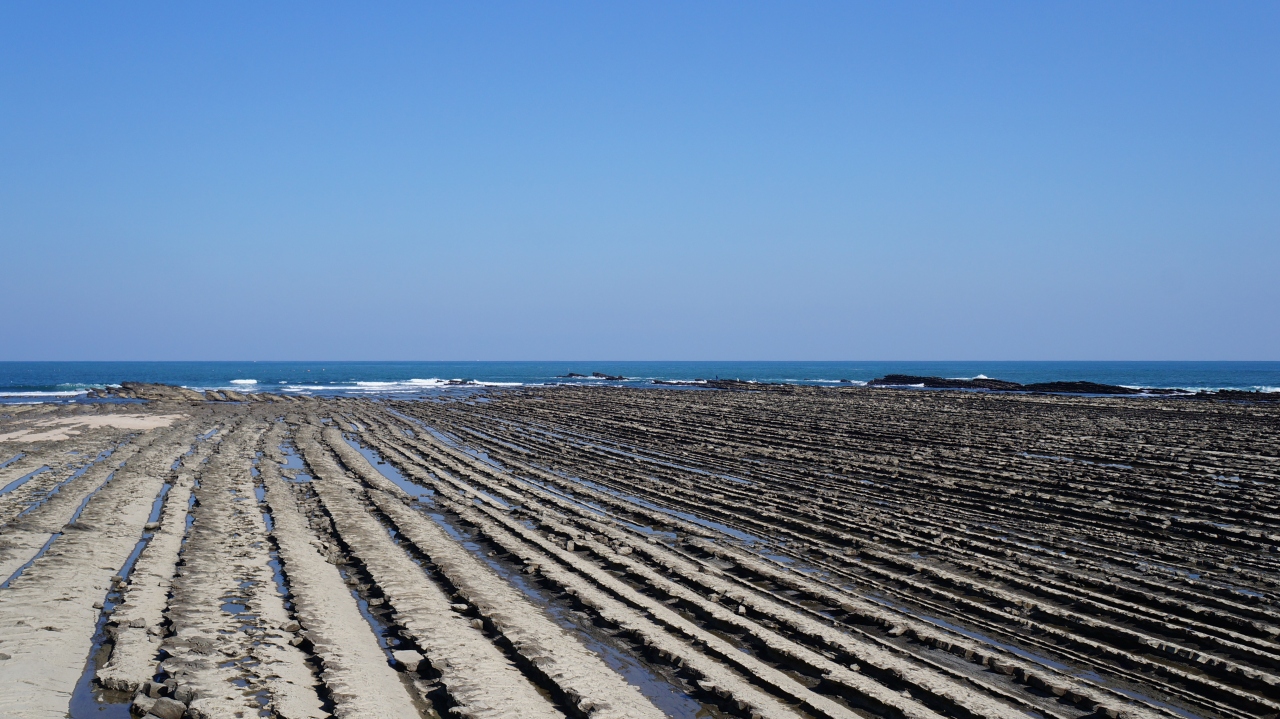 国指定の天然記念物で、200〜2400万年前に、海床に規則正しく堆積した砂岩と泥岩の互層が傾き、海上に露出した部分が、波の浸食を受け、固さの違いにより凹凸を生じたものだそうです。