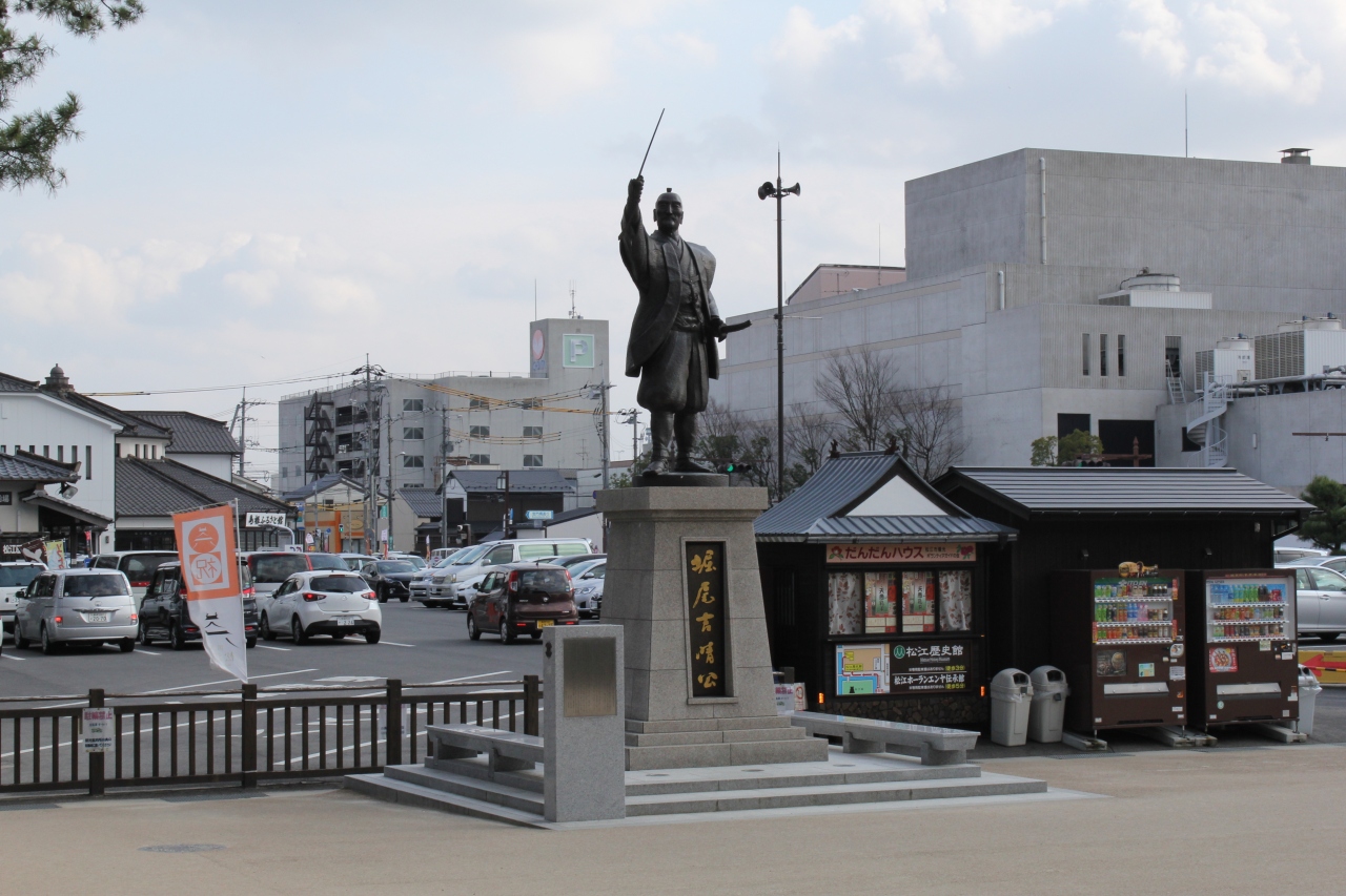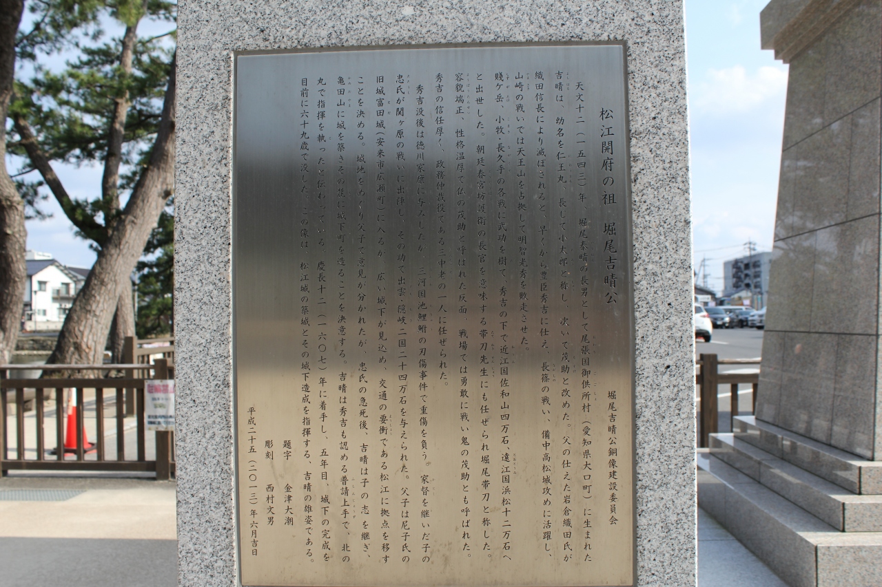 松江城の入り口、大手前広場にある像です。松江城に行く場合必ず目にするとおもいます。堀尾氏は歴史的にあまり有名な人物ではなく知りませんでしたが、豊臣秀吉に使え秀吉没後徳川家康に使え関ヶ原の戦いには東軍につきその功で松江城を築城したそうです
