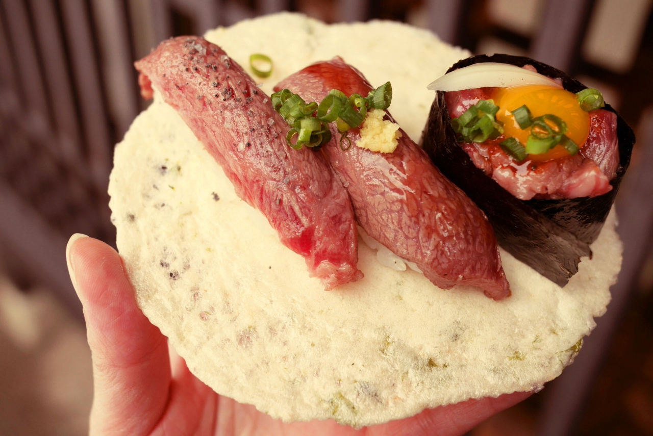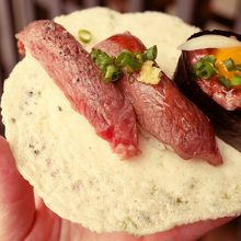 いつも三種盛りを頼むのですが、お皿がわりにおせんべいの上に乗せて出してくれるのですが、飛騨牛握りはもちろん、このおせんべいもなかなか美味しい。