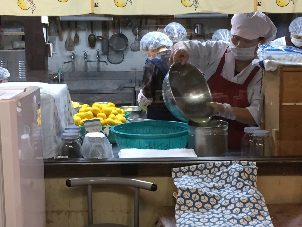 亀の井別荘内にあるお土産屋で、この旅館で使われる小物など、九州の特産的な品物が揃っていて、大変に上品なところです。名物のおはぎも食べられます。訪問した時は、柚子のジャム作りをたくさんの人が手作業で作っていました。